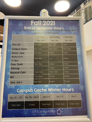 Food quality is worse than fast food, meat is often undercooked, food has been served rotten or moldy. Several of my class mates in recent times have gotten sick from eating here. Would rather eat prison food. Fix your food quality, I spend several thousand to eat here and more to attend the school and I could get better food at the Arby’s...