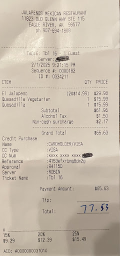 Ā Ā Ā Read moreIām very bummed to even be leaving this review. Iāve been coming to the Eagle River JalapeƱos for years and it has hands down been one of my favorite restaurants in the state of Alaska. Heck, Iād drive all the way from Mat-Valley for it even though we have plenty Mexican restaurants in the area. In the past, it was always a 5 star experience. I will say with the new location though Iāll give the entire experience 1 star. What was once a very fun āhole in the wallā atmosphere is now a common basic āfiner diningā experience. The seating before was very private and secluded with authentic fun chairs, now is traded for an open awkward layout where everyone can see you. They definitely traded their quality of food and drink, for their āfiner diningā. Previously it was very fast service, we were in and out quickly but would still linger and hang out with our drinks. It took over an hour to get our food and it wasnāt even busy. My BIGGEST complaint though is the margaritas. They were TINY!! Iām used to a goblet of margarita and was given a cocktail martini sized margarita that was half a$$ed. Very disappointing. The quality of our food was subpar to what once was, as well and the quantity. We used to get so much rice and beans and got a child sized amount. I understand wanting to upgrade location, but donāt trade that for the price of the experience. So very disappointed, I will be sticking to the...