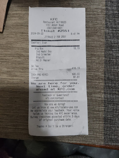 Read moreTwo stars because of customer service. I ordered two chicken strips meals and two chicken sandwich meals from the drive thru. I realized that they got the order wrong right after I started to drive away. So I got back in the very slow, very long drive thru line to let them know. Whoever I talked to on the intercom told me that they just put a new batch of chicken strips in and that they would be out in about 4 minutes. Told me to pull around front and they would bring them out to me. 20 minutes later while parked out front I had seen no sign of a single employee. I did see more and more cars pulling around front to park so the could also wait on their order. Because the lobby was locked closed because of COVID I decided to get back in line at the drive thru. The long, slow line. Once I got back to the intercom I was told that they would be bring them out to me in about 2 minutes. Asked if I could pull back around front. So I did. Another 15 minutes later and employee comes out to tell me he's really really sorry. That is going to be another 10 minutes, but he'll put some extra strips in the box. So I waited. Exactly 16 minutes later he comes out with the chicken strips that I ordered over an hour ago. In the meantime all the original food I ordered was now cold. All I got for my trouble was 4 extra chicken strips!!! Definitely won't be going back to abbott KFC. It without be quicker to drive to the other...