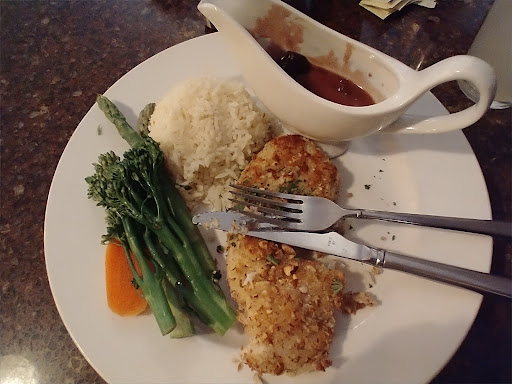 The scallops. For a measly $32, you get 4 1" diameter by 1" thick scallops, some peppers, and some rice in a cream sauce. Complete rip off. Have I mentioned that the seafood is a better value and a better dish at my HOTEL yet? This is a $18-20 dish at best. This being Alaska, I am pretty sure the peppers in the dish cost more than the scallops.