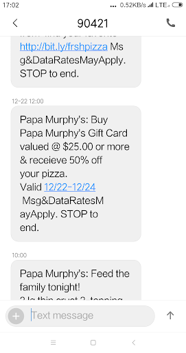 Read moreWent in to use a text coupon : *Papa Murphy's: Buy Papa Murphy's Gift Card valued @ $25.00 or more & receieve 50% off your pizza. Valid 12/22-12/24 *