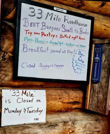 Read moreOld log building near the side of the highway north of Haines, AK, at, you guessed it, the 33 mile marker. Next stop north, the Canadian border. Not quite nice enough to be cozy or quaint, with a handful of tables, and really overall mediocre food. We weren't particularly taken with anything we tried there. The drive there from Haines is pretty, but not spectacular. Knowing what we know now, we wouldn't...