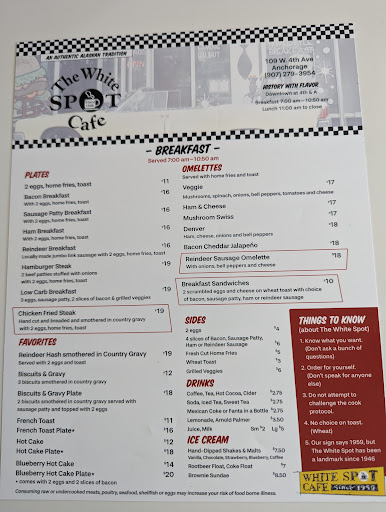 A wonderful experience every time I have eaten at White Spot. I've brought my friends and family to dine at White Spot and everyone raves about the breakfast, halibut burger, hamburgers...Every single food item we have tried is fresh, flavorful and just absolutely delicious. The staff who have served us are just as wonderful, the owner is so personable and seems to really care about your dining experience at her establishment and John is also such a pleasure to talk to. It's refreshing to be appreciated as a customer. I highly recommend White Spot and although the location of this restaurant may suggest that it is a hole-in-the-wall, when you walk in you are immediately brought back to the historical times in Anchorage because the walls are adorned with art pieces and decor that are filled with memorabilia from Alaska's past and the atmosphere and music (classic pop hits) make you feel like are just brought back in time. The laid back and and sit-where-you-want, will allow you to find "your perfect spot". A++++ experience! Thank you White Spot for really caring about your customers!! Your restaurant is on the top of our...