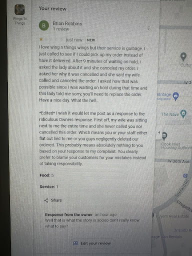 Read moreI love wing n things wings but their service is garbage. I just called to see if I could pick up my order instead of have it delivered. After 9 minutes of waiting on hold, i asked the lady about it and she canceled my order. I asked her why it was cancelled and she said my wife called and canceled the order. I asked how that was possible since I was waiting on hold during that time and this lady told me sorry, you’ll need to replace the order. Have a nice day. What the hell…