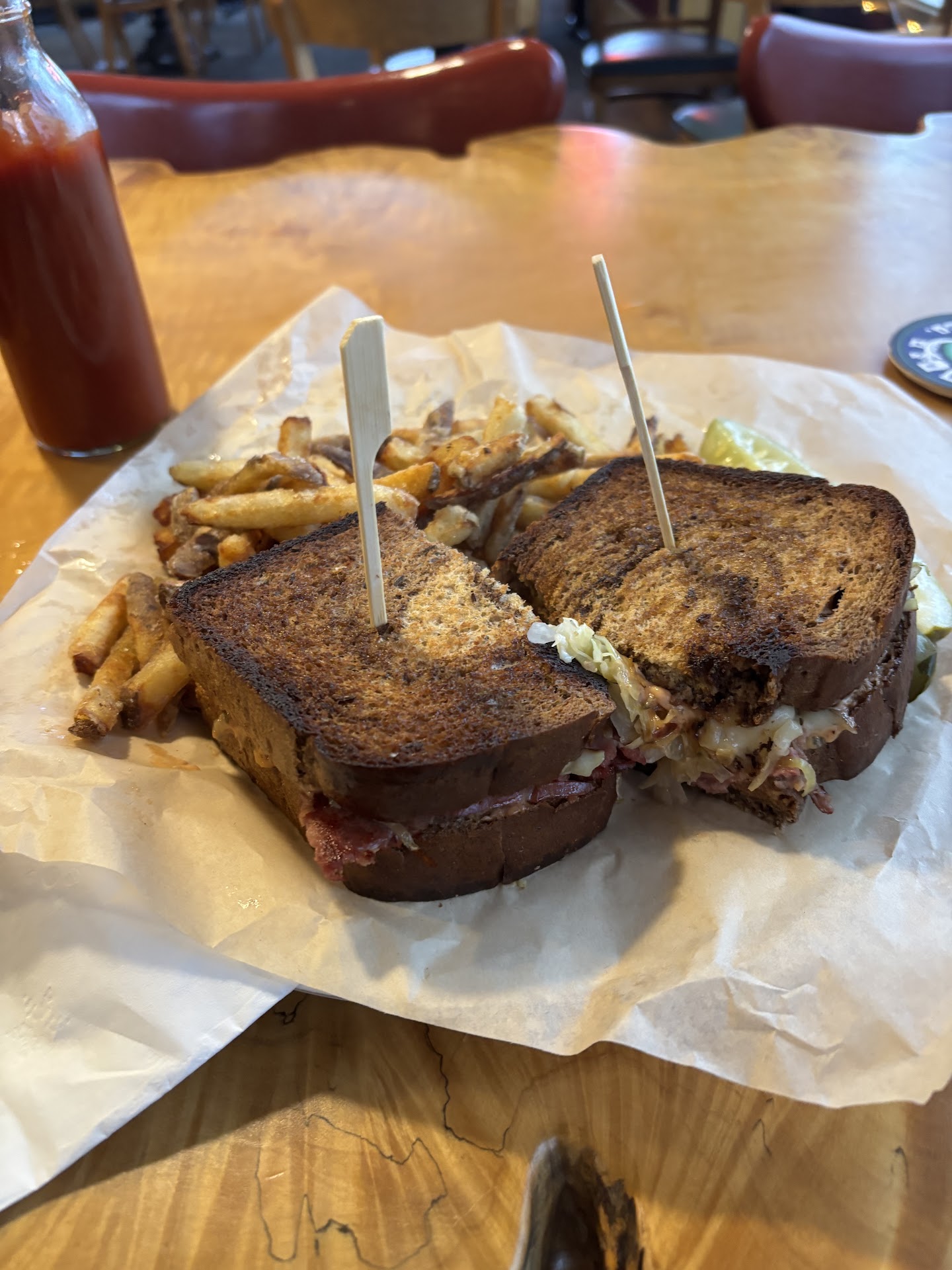 Was looking for a bite to eat while passing through Albany and saw that this brewery had great reviews. We figured we’d give it a try. As soon as we walked in the vibes were off. It was very stuffy and smelled bad— almost like stale alcohol. No one greeted us so we awkwardly stood at the entrance until my partner saw a small sign stating that you need to order up at the bar if it’s after 3pm. We made our way up to the bar and ordered. The worker who took our order was fine. Not particularly friendly but not rude. We ordered a Caesar salad with chicken, an order of the pretzels and beer cheese, and a burger with fries. The total came to just over $43.00 and, of course, they asked for gratuity. Our food came out after about 15-20 minutes, which is reasonable , but the salad was tiny!! The chicken, which was $4.00 extra, was almost nonexistent. The food was edible but nothing special and really not that great. We also had to bus our own table…. After we left my partner and I did not feel well and agreed that the food left us feeling sluggish and heavy (and again, I got a salad…). We both agreed that that is one place we would never go back to and, quite frankly, we regretted not walking out the second we walked in. We would...