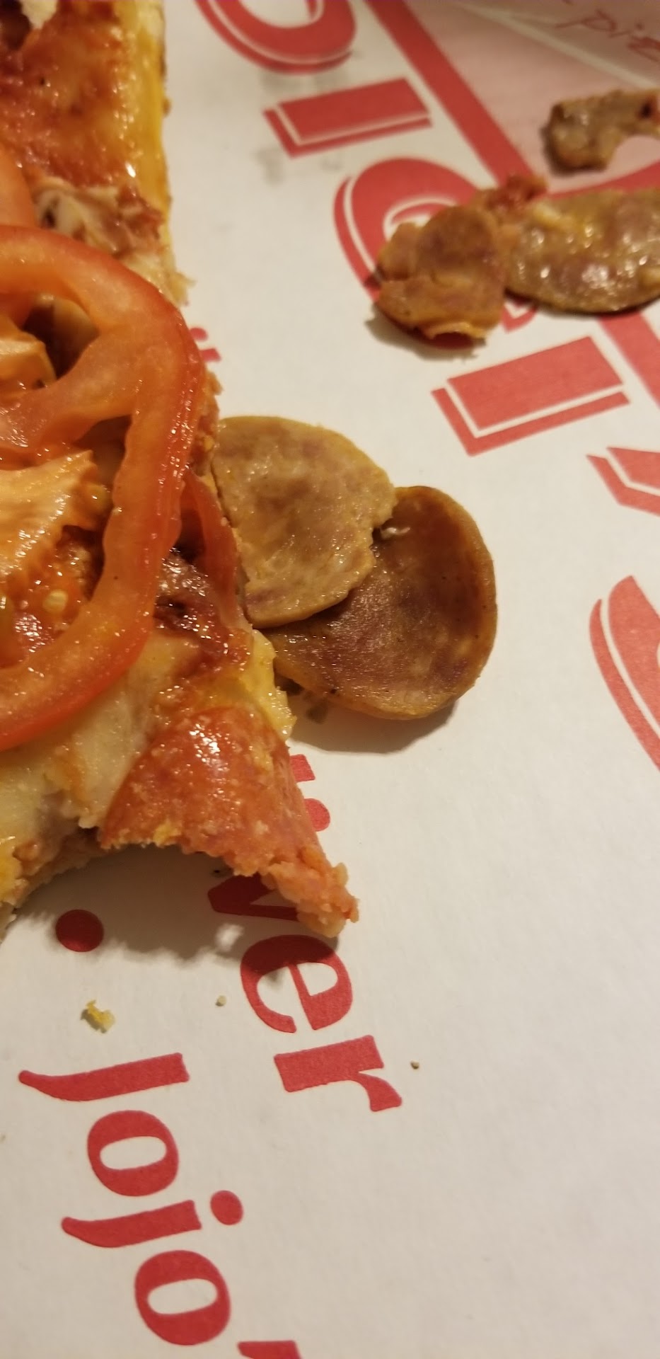 My wife commented that the pizza tasted off... That's when she realized the Linguisa looked bad... it wasn't noticed initially because all of the Linguisa was underneath the tomatoes. It was BROWN; not the normal color of Linguisa. It was definitely not overcooked.