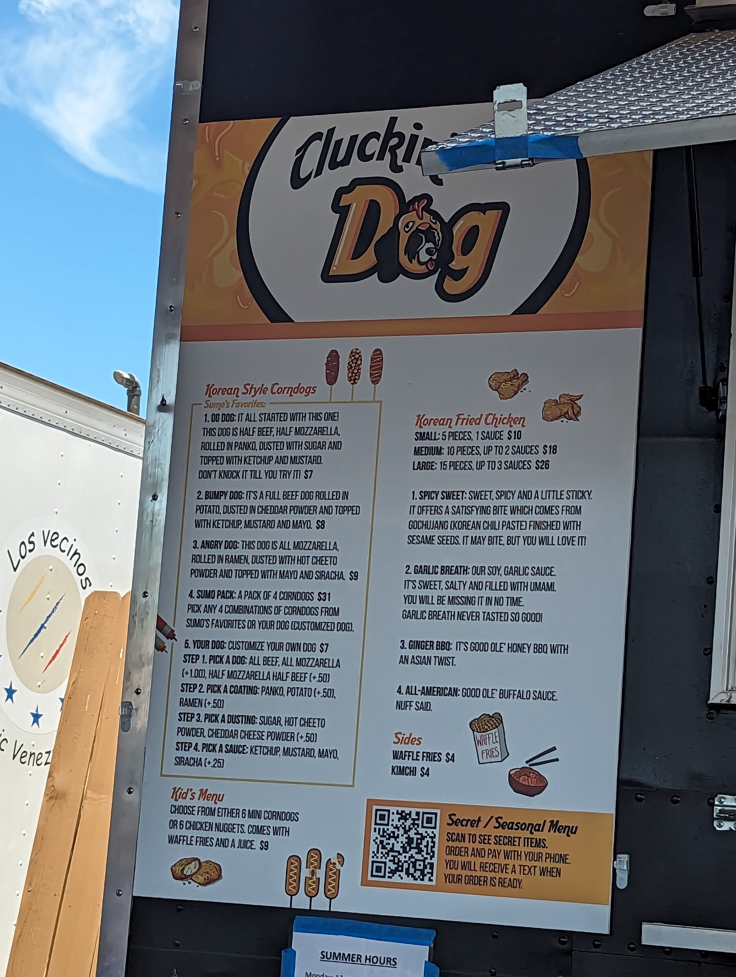 I am so glad my colleague dragged me out of the office today for lunch! I was delighted with my meal at Cluckin Dog. I rarely eat outside of my comfort zone but something about those designer hotdogs grabbed my attention. Sai, the owner and all-around amazing person, suggested the Bully Dog. In a nutshell, you get an all-beef dog on a stick, blanketed with some kind of delicious breading blanketed with diced potatoes, sprinkled with cheesy powder and garnished with ketchup, mustard, and mayo. Now, I'm not gonna lie, they're a little ugly but don't let that stop you. These dogs are out of this world. I also ordered waffle fries and got a very generous portion. I have no idea what kind of wizardry went into making the fries but they were like warm BBQ chips, only better. What an excellent way to cap off the work week. Sai,...