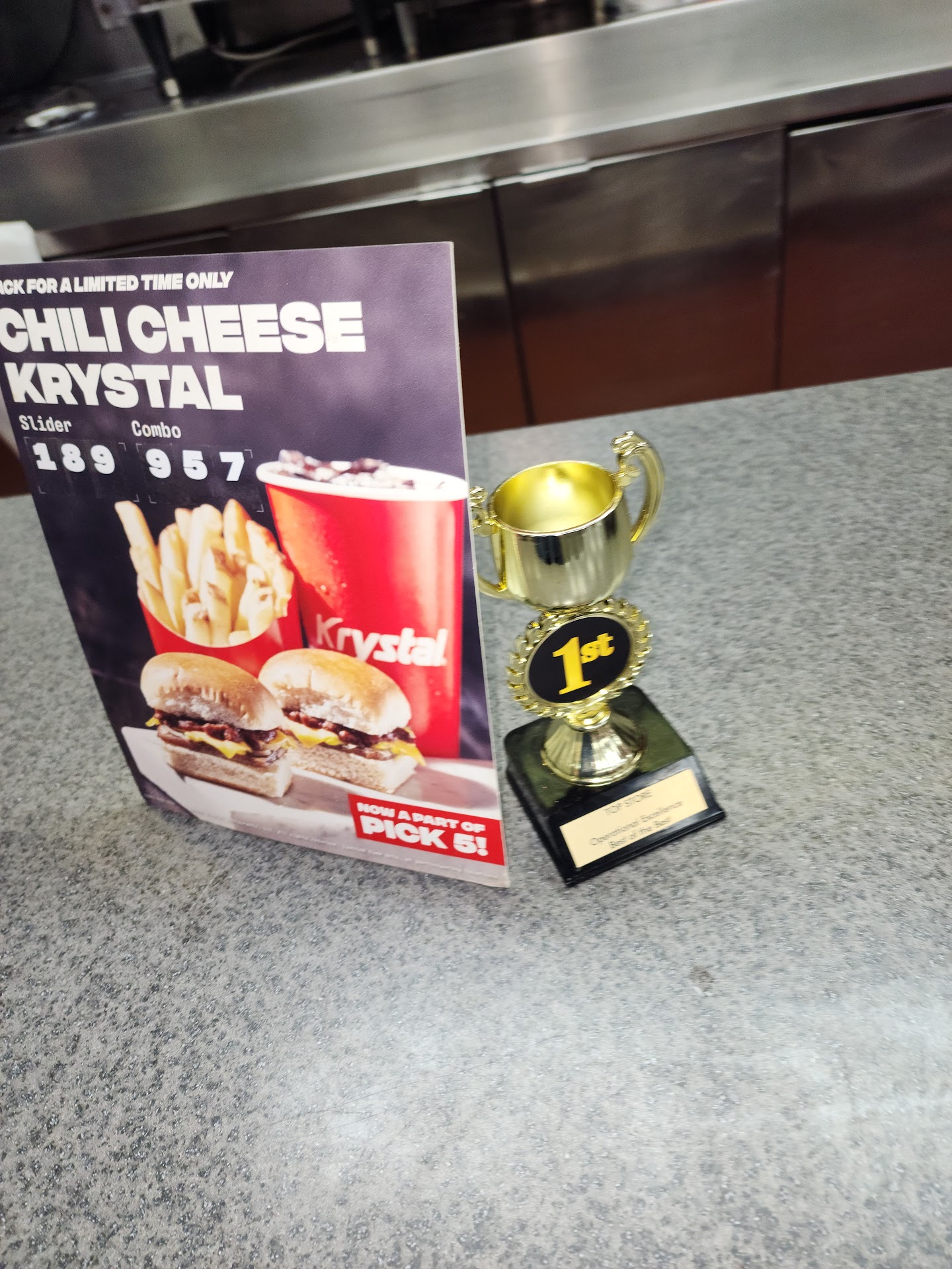 Read moreI went through the drive thru. First of all I had to wait 7 minutes before getting my order taken. 8 minutes later I was finally at the window to pay for my order. Did I mention I was 2nd in line behind the one that was already sitting at the window. Idk how long they've been sitting there. They were asked to pull forward.Anywho the cashier takes my payment and gives us our drinks. She then asks us to pull forward. There was a car and truck in line behind me. They were given their orders and wasn't asked to pull forward. We ordered Krystals with cheese and some fries and classic and chili cheese pups. After waiting for 10 minutes some one finally comes out and hands the first car their order. They go back in then for about 5 minutes then comes back out to us without our order and says they got our burgers cooking and she's dropping some fresh fries so they could be hot when the burgers come up and then she'll have our order to us. So we thanked her for the update. She stands outside having a whole conversation with her friend then goes back inside.Here she comes 10 minutes later with our order. We checked our order. Everything in the bags was cold except the fries. Wtbs we waited 40 minutes at a fast food restaurant...
