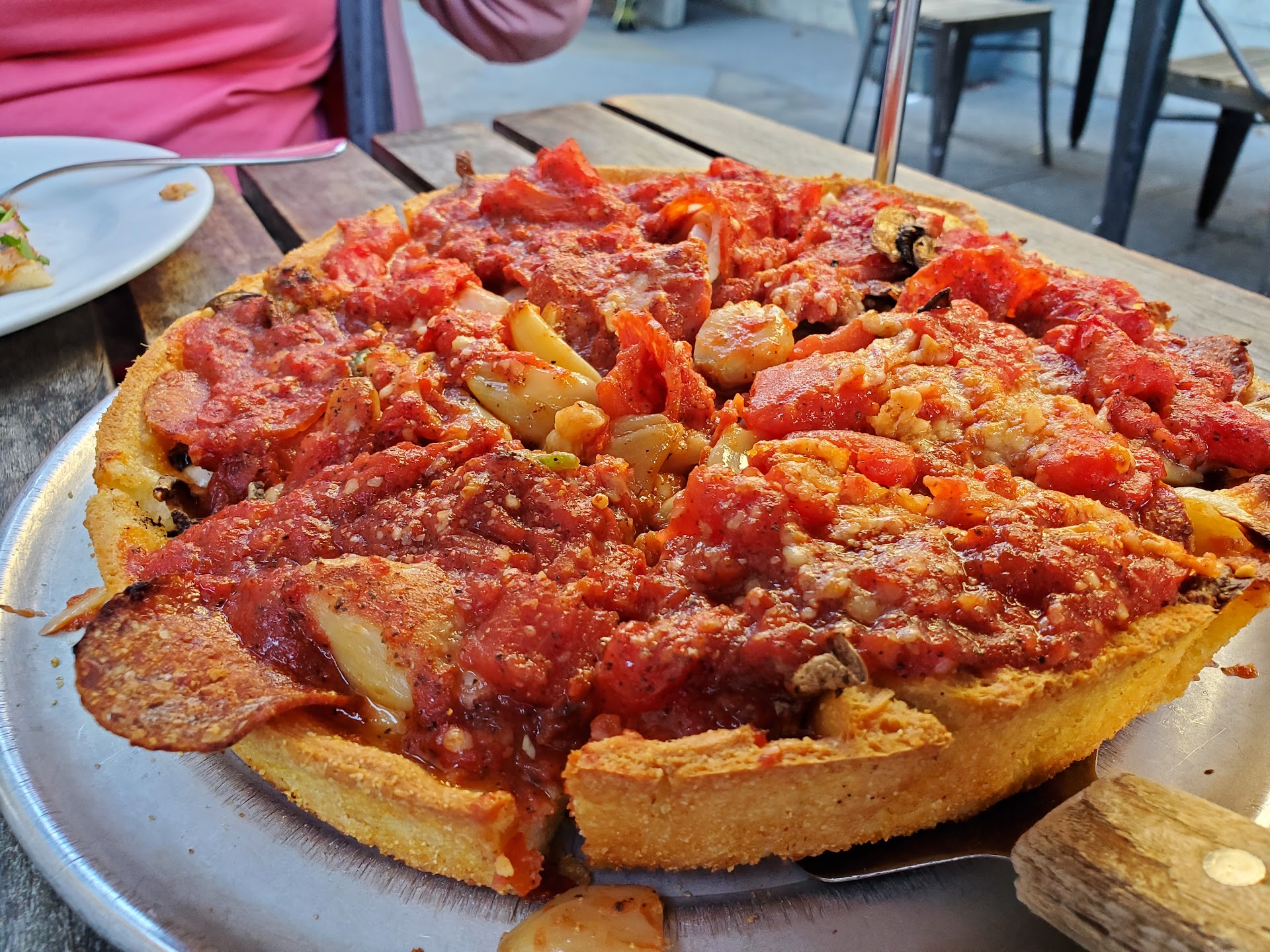 A friend had told us to try the deep dish pizza, so we shared a large “Old School,” which had mozzarella, olives, onion, and pepperoni, all topped with a thick tomato sauce. The toppings, especially the rich sauce, were quite flavorful. Although I could detect the flavor of the pepperoni within the sauce, I didn’t see many, and they were not prominent. I personally didn’t like the hard, cornmeal covered, cracker-like crust. Perhaps it was needed to support the weight of the toppings, but I missed the more traditional bread-like crust.