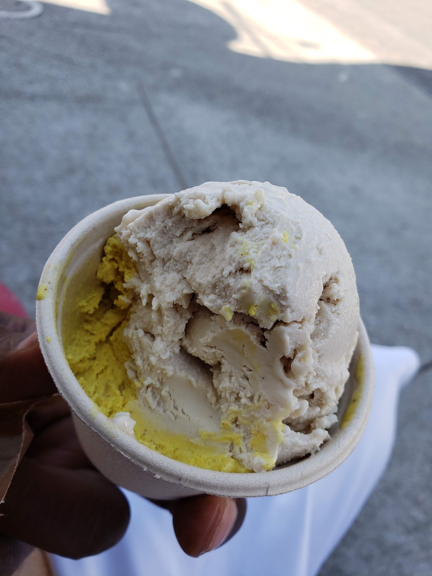 I ended up going with a half scoop of coconut and the other half mint chocolate. Yes, it has a slightly different taste but pair well. My friend had the turmeric spice and the vanilla, I didnt taste the combo but I did sample the turmeric and it was really good. The taste reminded me of a peanut curry sauce, which I make at home regularly so I loved it.