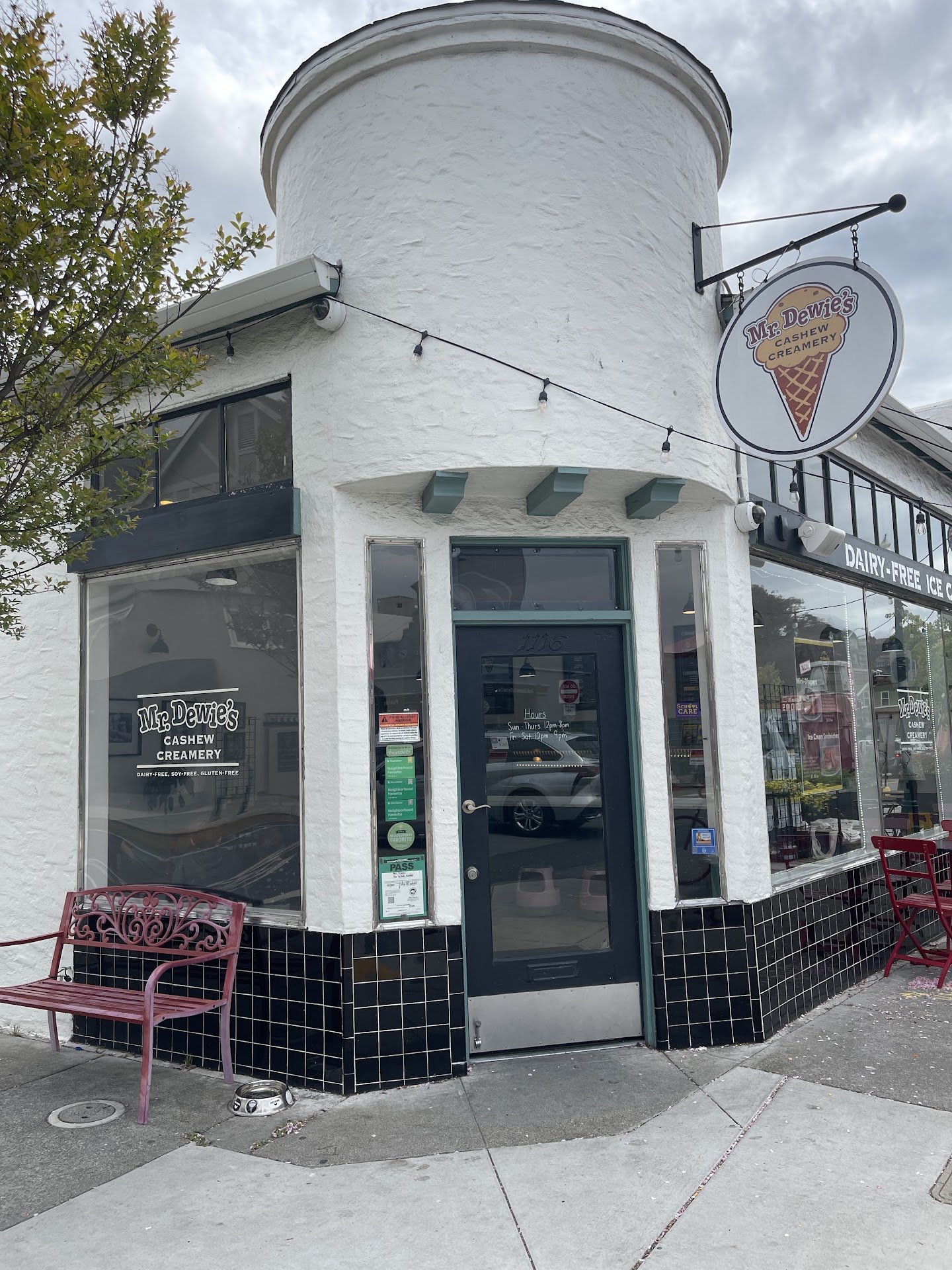 I asked for Albany recs & this one popped up a few times so we had to visit. I decided to park up the street a bit & we got a chance to walk Solano Ave (okay I saw an open spot & took it because you just never know). This street is so cool & has so many restaurants, shops, & businesses (medical offices , real estate etc). There are nice shade trees with benches underneath & colorful bike shaped bike racks. The kids loved seeing the different colors. 🌈 Okay onto the ice cream. 1) it’s so good 2) it’s vegan, organic, soy free, gluten free, & additive free. ((Plus I prayed over it so it had zero carbs & calories 😅) There were so many options & the kids were restless so I went w/the bon bon sampler, small little ice cream balls coated in chocolate shell 🤤 we got vanilla, mint chip, raspberry, & strawberry. They were all so good but I think my personal fav was the raspberry. The kids had fun eating them & trying their best to not have messy hands (impossible!). Other items on the menu include cones, cups, pints, cookie sandwiches & of course toppings. When we arrived we were the only ones there but quickly after it filled up with 4 people behind us waiting to order. The cashier/ice cream slinger was so kind & helpful. We sat outside on a bench to eat our delicious treat. There are 3 @mrdewies locations in the east bay, but this is the only spot that serves the bon bons.