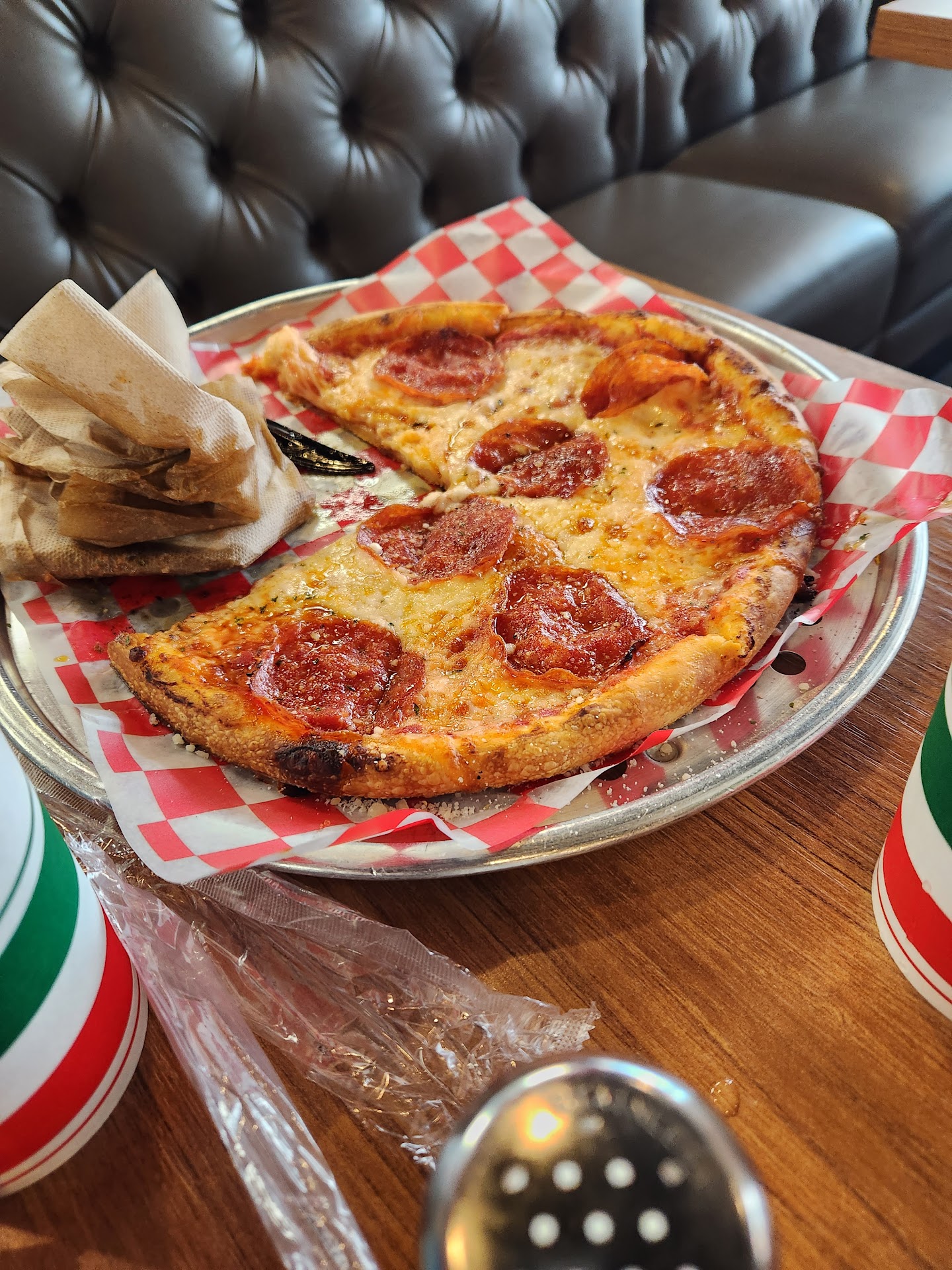 Cons: Staff has no concept of proportions and balance when placing toppings, throws the taste of the pizza way off. Friendliness could use a slight bump. Pizza was brought out on THIN piece of paper on top of a perforated pizza tray. Which wouldn't be a huge issue, but the pizza was very damp on the bottom and easily dissolved the paper. Didn't see any plates anywhere, though plastic forks/knives are available.