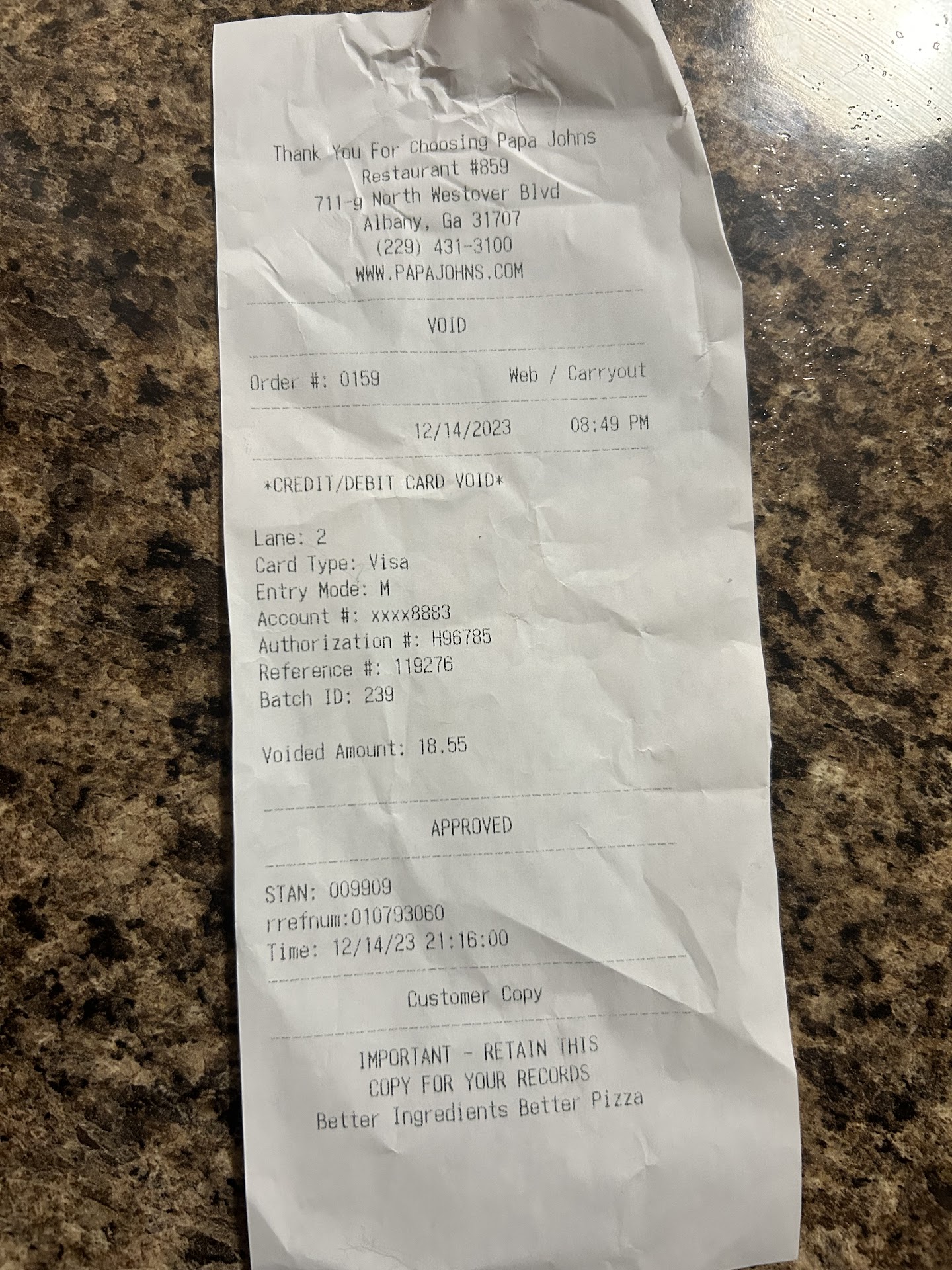 Disgusted and disappointed! Never thought I would ever say that about Papa John's. I placed an order online. Stated it would take 95 minutes but I didn't mind because it's Papa John's so it's worth the wait right? The pizzas, if that's what you want to call what was delivered arrived in less than an hour. It might as well as been made at Dairy Queen for all that it was a satisfactory order. The pizzas were not even cut. It was not fully cooked. The cheese had not melted in the center. The order was incomplete. I was missing several sauces that I paid an additional cost for. One of the sauces I ordered had spilled inside the box. When I called the store, the young lady informed me that she could give me a credit for the sauces in my next order. I explained that I already gave the driver a tip, she said there was nothing she could do. She said next time I order online don't add a tip on the website.