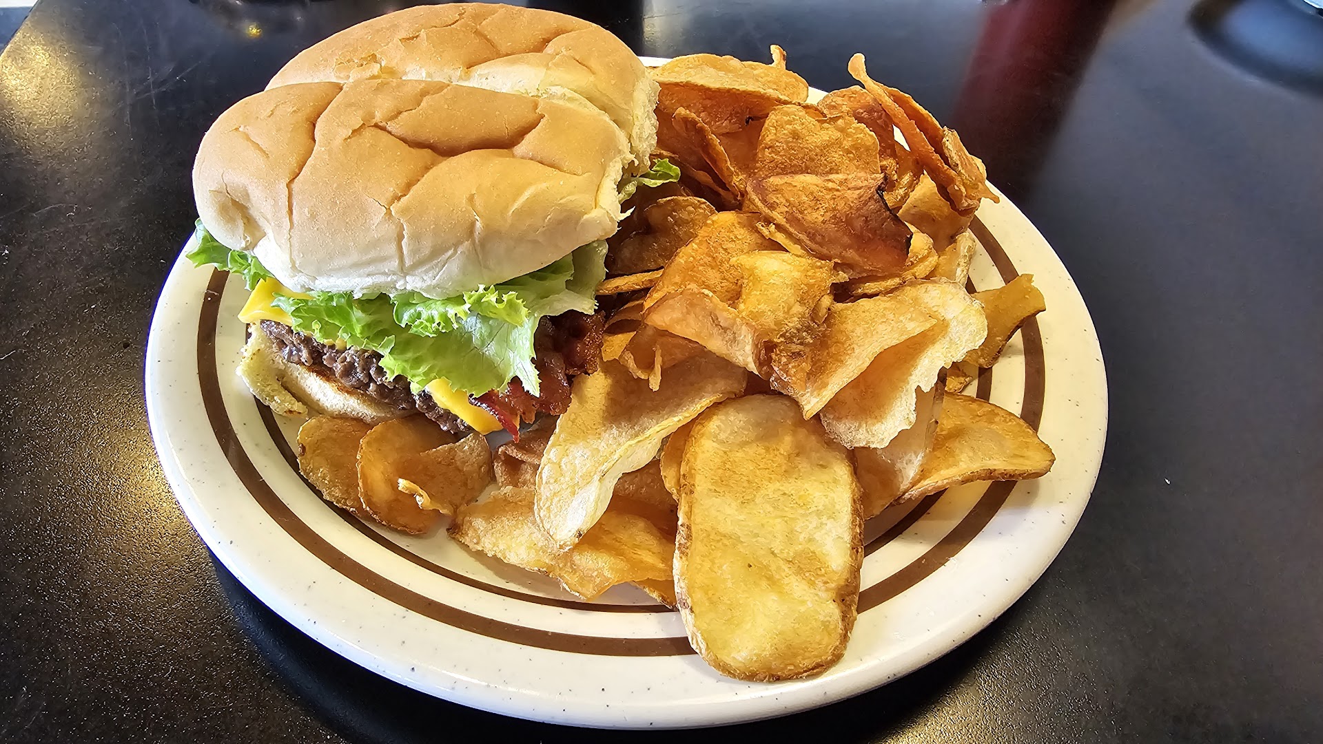 Now let's talk dinner. Every day has a special and you will never go wrong with the special be it meatloaf or noodles or roast meat. Sometimes I like a good burger. It doesn't have to be expensive or fancy, the cook just needs to care a little bit to sear it just-so and get it to the "THAT'S WHAT I'M TALKING ABOUT" stage of beefy flavor. Ray and her cooks put a little love in their work and you'll taste the difference. My burger of choice is just bun, burger, bacon, bbq sauce, onion rings, and that's it, burger perfection. Their fishtail sandwich is the larger, tastier version of deep-fried fish, hot and crispy. The taco salad will fill your belly with some fresh veggies. Oh, and the brisket-stuffed potato skins are terrific! I could go on, but we need speak about desserts.