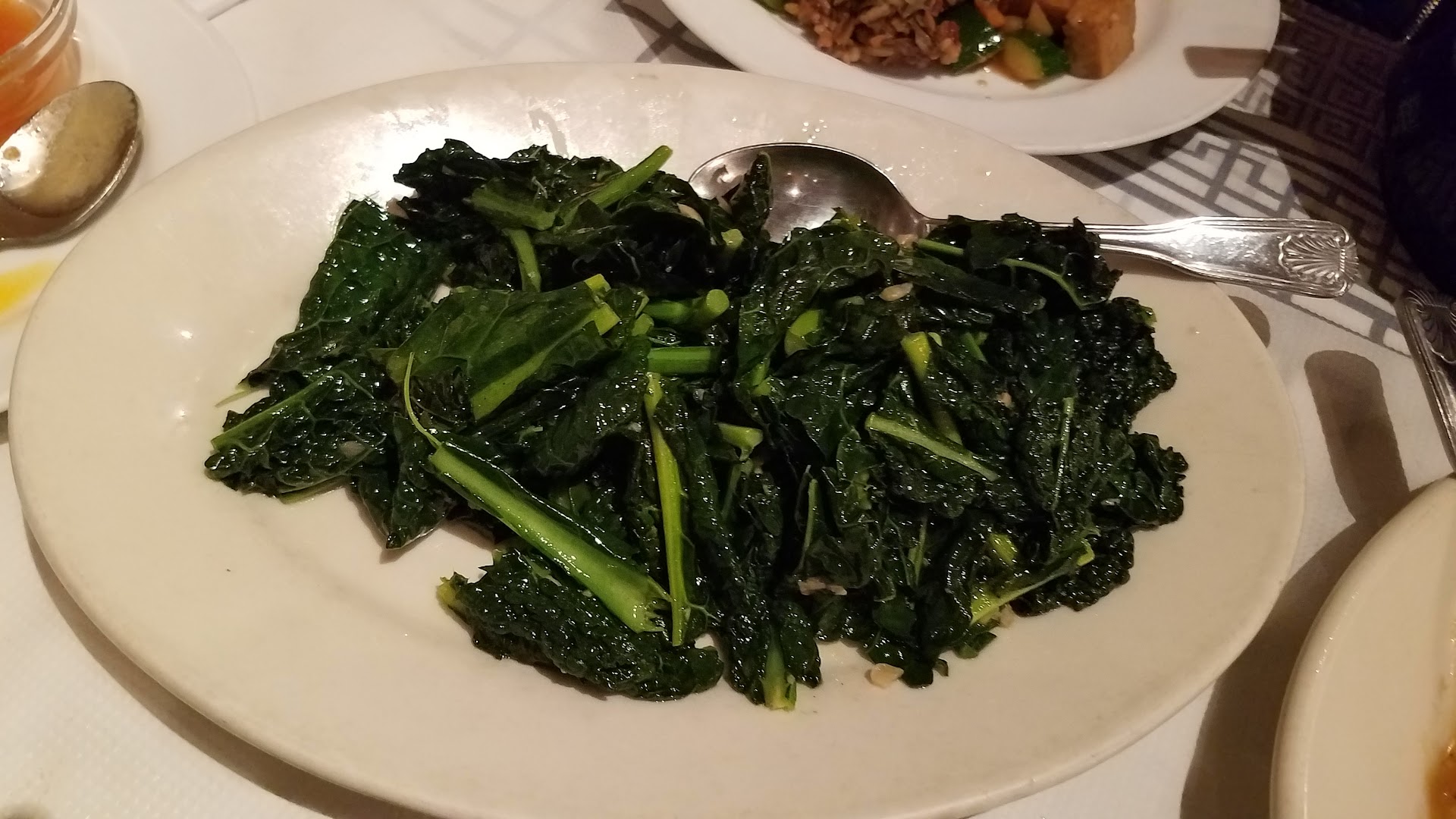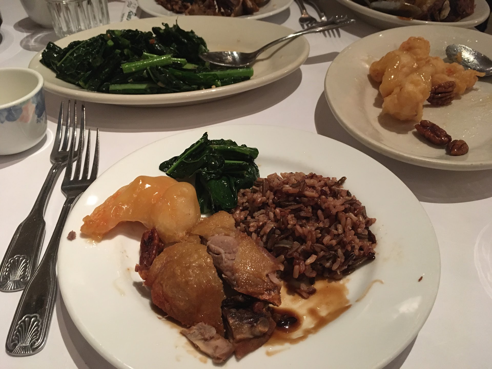 My picture doesn't do it justice but their walnut prawns are airy and crisp, the crispy duck is well seasoned and tasty, the garlic kale is bright green and tender, and the brown rice is blended with wild rice and is beautiful with a great texture.