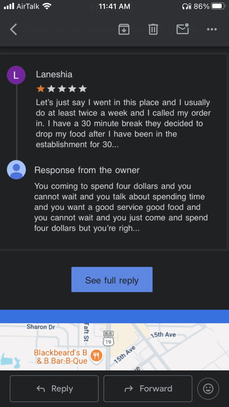 Read moreLet’s just say I went in this place and I usually do at least twice a week and I called my order in. I have a 30 minute break they decided to drop my food after I have been in the establishment for 30 minutes for my break was up and when my food came up, my chicken was hard I spoke with the owner and the owner stated to me that it takes time to make the order but that is invalid because two people came in and ordered before me, and they foods were ready in time, but mine was not terrible customer service. They have a lost a guaranteed customer. Terrible terrible management.. before the owner rudely replied to my this was the owner will leave replied to my review And deleted it by just replying with a 🌹 he is nasty and he commented that I only spent $4. That just shows right there that he’s unprofessional. They come to black known areas and make money off us then want to treat us any kind of way. The chicken was so hard it was black. Instead of correcting it he simply became rude! I’m adding the screenshot of the REAL REPLY from...