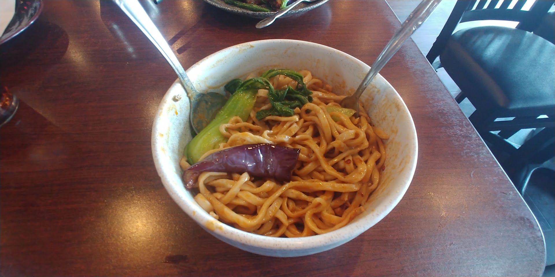 Spicy Hot pot noodle with lamb: Spicy with not so subtle hints of cumin and chilli oil that coats your mouth with deliciousness. This dish is simple but good. It's got a good ratio of lamb, choy, and noodles in a spicy broth you'll want to slurp.
