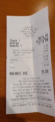 Read moreTraveling with a toddler (and pregnant) and not wanting to order fast food, we decided to get take out pasta from Green Mill in Albert Lea.