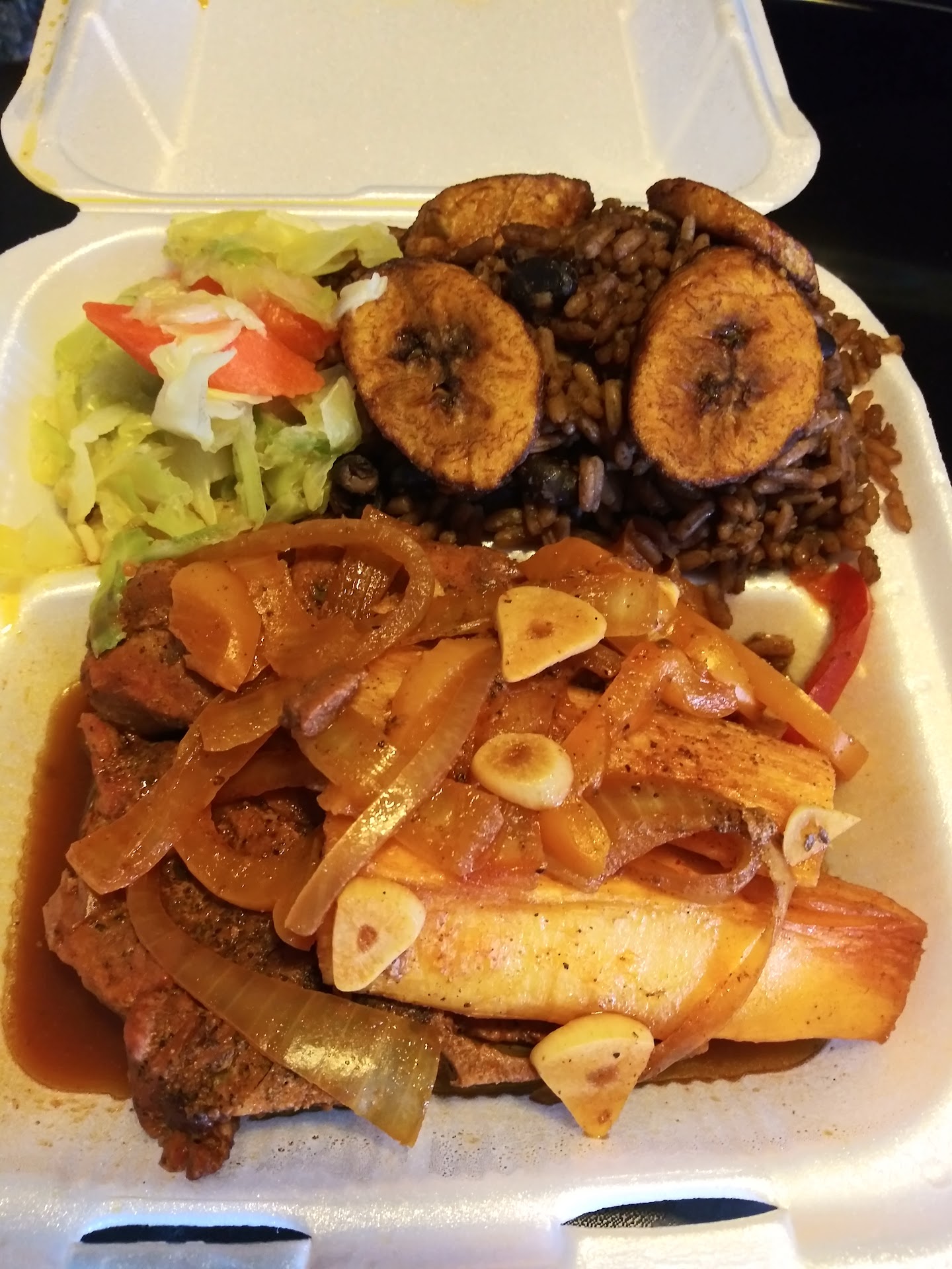 Example: I ordered a plate of Stew Chicken and got a small size for $13.00. I ordered a side of fried plantains, $5.00. And 1 Goya Cola Champaign, $4.00! This is highway robbery! Let me tell you what I received: 4 small pieces of chicken...not even the whole leg, or thigh or breast. 1 measured cup of rice/peas. 1 spoonful of boiled cabbage/carrots. Total: $25.03