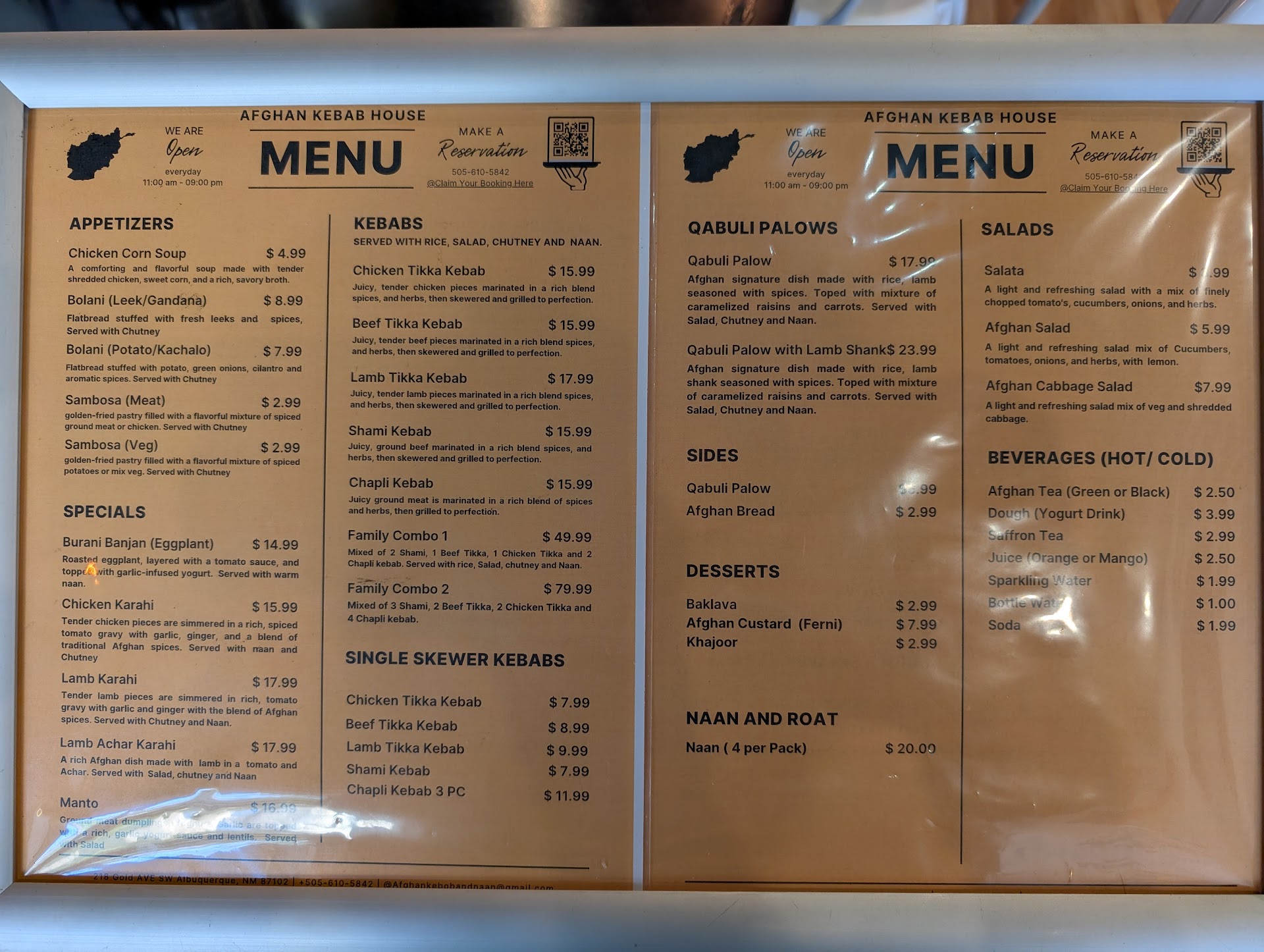 We stopped by Afghanistan Kebab House on a busy Saturday night, and the place was nearly at capacity—a good sign. I placed a to-go order, and despite the crowd, the young man at the counter was friendly, helpful, and even apologized for what turned out to be a very minimal wait.
