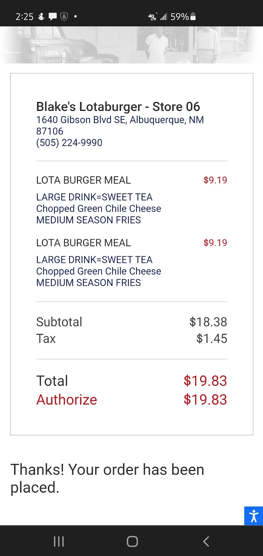 Ā Ā Ā Read morePulled into blake's this morning at 0655 ish, 5 cars in drive threw. When I got to the menu to order I was polity welcomed and asked to wait 4 min pass no cars move still 5 cars in the drive threw, I decide to go to chick fil a next door. Pull in to chick fil a at 0701 my order was placed by 0702 and left chick fil a at 0702 and 50 seconds. I look at blake's again, 4 of the 5 cars are still waiting. This blake's location has a reputation on base to be the slowest in town. I understand making food fresh and how it works but growing up as a native New Mexican I have been going to blake's my whole life and they were never this slow.