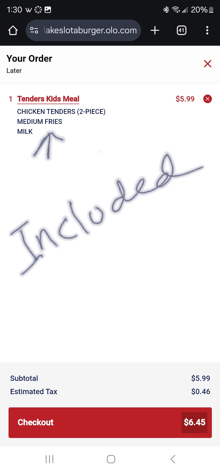 I went to their website because I couldn't believe that 2 chicken tenders were 5.99 and fries and drink extra ON A KIDS MEAL, of course not! It's clear that it's a meal and it is supposed to be included!!!! This place needs a new manager, and employees need training. Clearly we...
