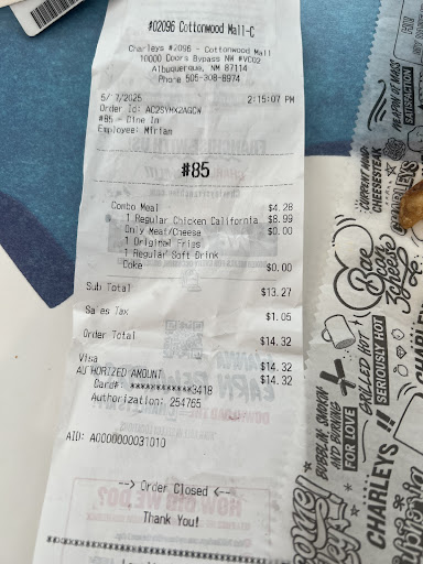 Ā Ā Ā Read moreMy family regularly orders takeout from this Charleys location every couple of weeks. The food is consistently very good. However, tonight after shopping in the mall we attempted to order takeout at this location (in the mall food court). We were told by the cook that at 6:15pm it was too late to order because the location closes at 7pm. However, the cashier let my husband know that they were continuing to make sandwiches for online orders. We ordered our takeout online, which was ready within 15 minutes (still 20 minutes before the restaurant was due to close). When we picked up the order we were told by the cook that if we ever "did this again" our order would be refunded and not fulfilled. While this is a favorite spot for our children, we will not be returning to Charleys with such...