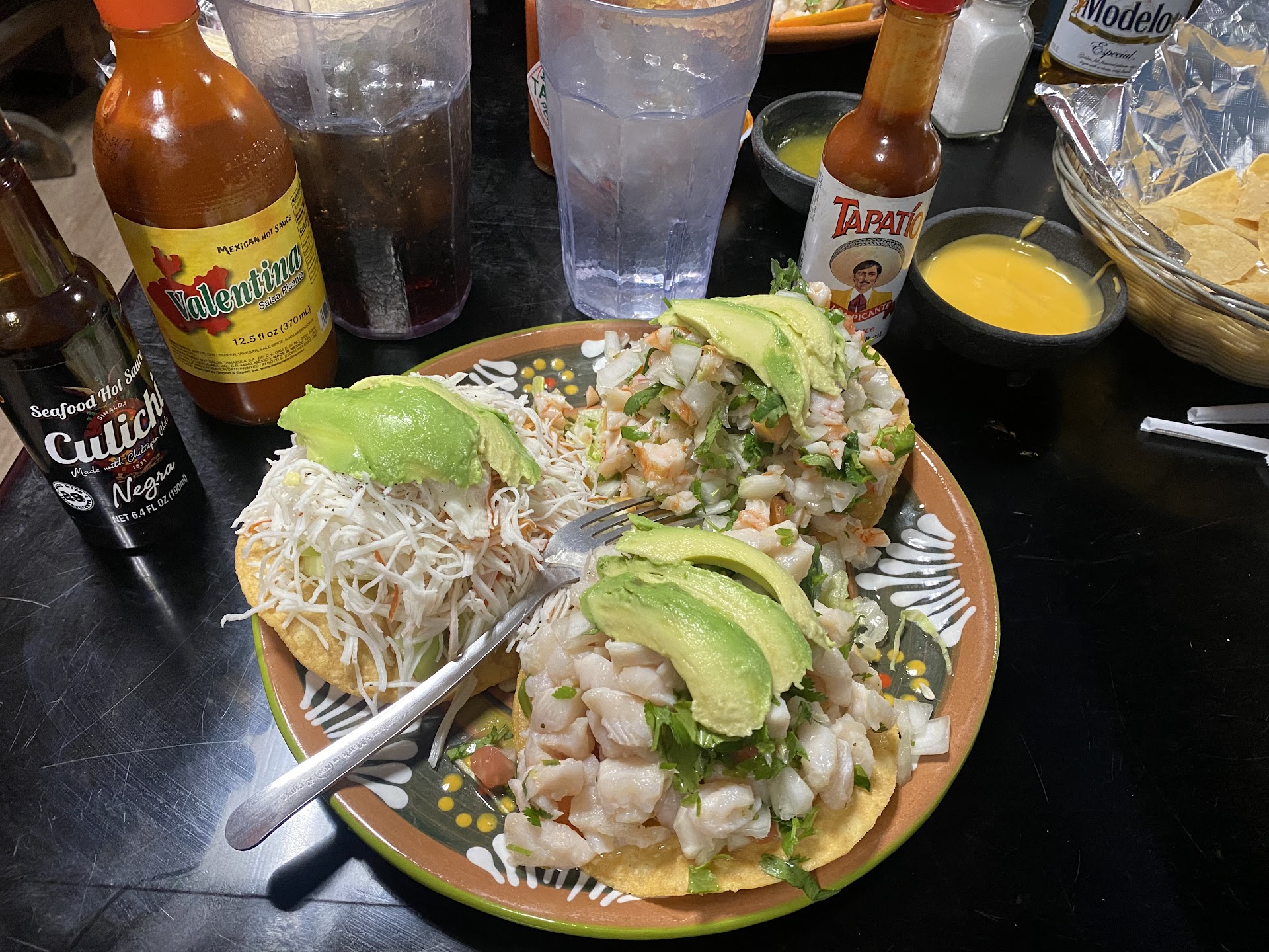 I have been wanting to try this place so I finally went in for a late lunch/early dinner. I love seafood and I knew they had it on their menu. SO I ordered oysters on the half-shell. Yes, you heard it right, 6 medium oysters, RAW, fresh and tasty for $6.95. I ate them them with lemon and their wonderfully picante salsa and a couple of dashes of hot sauce. Delicious with an ice cold cerveza. Next for me was their shrimp ceviche tostada. OMG! Only $5.50! I received a huge mound of marinated chopped shrimp with chopped tomato, jalapeno, cilantro, generous slices of avocado, served on a corn tostada on a bed of lettuce. I squeezed lime juice on all of that, topped it with some of their salsa and was in ceviche heaven! I couldn't eat it all. I had to stop there. End of eating. What a bummer! They do bring you a complimentary basket of chips with salsa when you're first seated. The salsa has a bite and is not for wimps so I did consume a lot of that. Had to ask for more it was so good! I eat extremely hot foods so for a restaurant, I thought this salsa was extremely good. Probably the best I've had in ABQ. It had nice fresh slices of scallions and cilantro, like the sauce was just made right before you got there. If you like your salsa a little more acidic, a few squeezes of lime will take care of that for you. They also have a roasted green chile salsa that you can ask for. If you ask for hot sauce, they bring you three, Tabasco, Tapatio, and Cholula. I forgot to add that the shrimp in the ceviche is actually cooked and I don't mean by the marinade. I'm glad I stopped by. The food was fresh and delicious. The service friendly. The owner talked with me about the business and we shared some ideas. He told me they had a packed Cinco De Mayo with music outside on their patio. I'm sorry I missed that. He hopes to start having music on Sunday afternoons with food and drink specials. That sounds like fun! Their hours now are Sun. thru Thurs. 10am-6pm, Fri.-Sat 10am-8pm. They serve breakfast all day even though the menu says only until 11am so don't be afraid to ask. I can't...