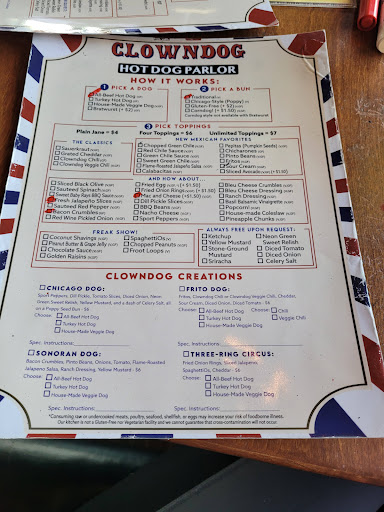 Read moreI have been on the hunt for a new hot-dog joint since the one that filled that sweet childhood nostalgia spot for me closed a few years back, but my search is now over. I enjoy food much to the displeasure of my waistline, but it means that when I find a place that is worthwhile I really appreciate it. Clowndog is one of those places for sure. The location itself is awesome, and the owners did a great job turning the dirty old Ragin shrimp into a warm, friendly, clean, and relaxing environment (unless you're scared of clown art that is, but I'm not!). The waitstaff are friendly and attentive. On to the most important part, the food. The menu is expansive when it comes to the toppings you can put on your dog, and every single one of them that I tried (and it was a lot) was great quality. Their hot dogs are juicy and flavorful and the buns reminded me of what a hot dog bun should be. Lastly I would be remiss to fail to mention the secret star on their menu, their house made veggie dog. I am not a vegetarian. I love me some animal based foods, but I tried the veggie dog out of curiosity and I have to say I enjoyed it just as much as the regular hot dog I had. As a vehicle for toppings its by far the best non-meat sausage unit I have ever consumed. Clowndog is going to be a regular stop for me for sure. Go check it...