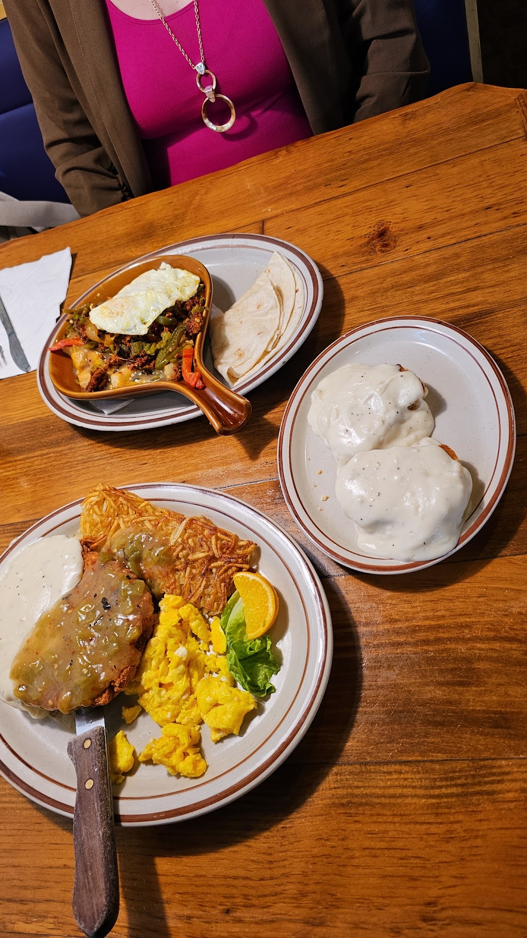 This meal was very disappointing. We ordered take out and when I entered the building there was a weird burnt smell. The casher handed me to bags and read my order back to me. The put a sticker on the bags to seal the order for I did not check to make sure all the food was there. When I drove my 15 minutes home, we found out that they did not pack my biscuits and gravy (the order was a biscuits an gravy breakfast.) I ordered the pancakes, which was extra with the hog omelet and they were missing as well. The beer battered zucchini was fine but the ranch was flavorless. The hash browns on both breakfasts were also flavorless and needed salt and pepper or some thing! This was 60.00 dollar meal and to find out that food, tat I spend extra on, was missing makes me so mad. This was far from my home and it is a long drive and not worth going back but I will NEVER eat there again! This was the second time we ate there The first time was dine in and the service was ok. It was a Sunday and the were busy. They did not fill our water and they forgot our pancakes for the breakfasts AGAIN. If you still choose to go there, make sure you check you food before you leave They are carless with...