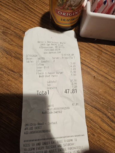 Read moreFirst - my husband and I have been servers, so we understand that everyone & every place has an "off" day. Tonight was that day for this Denny's location.