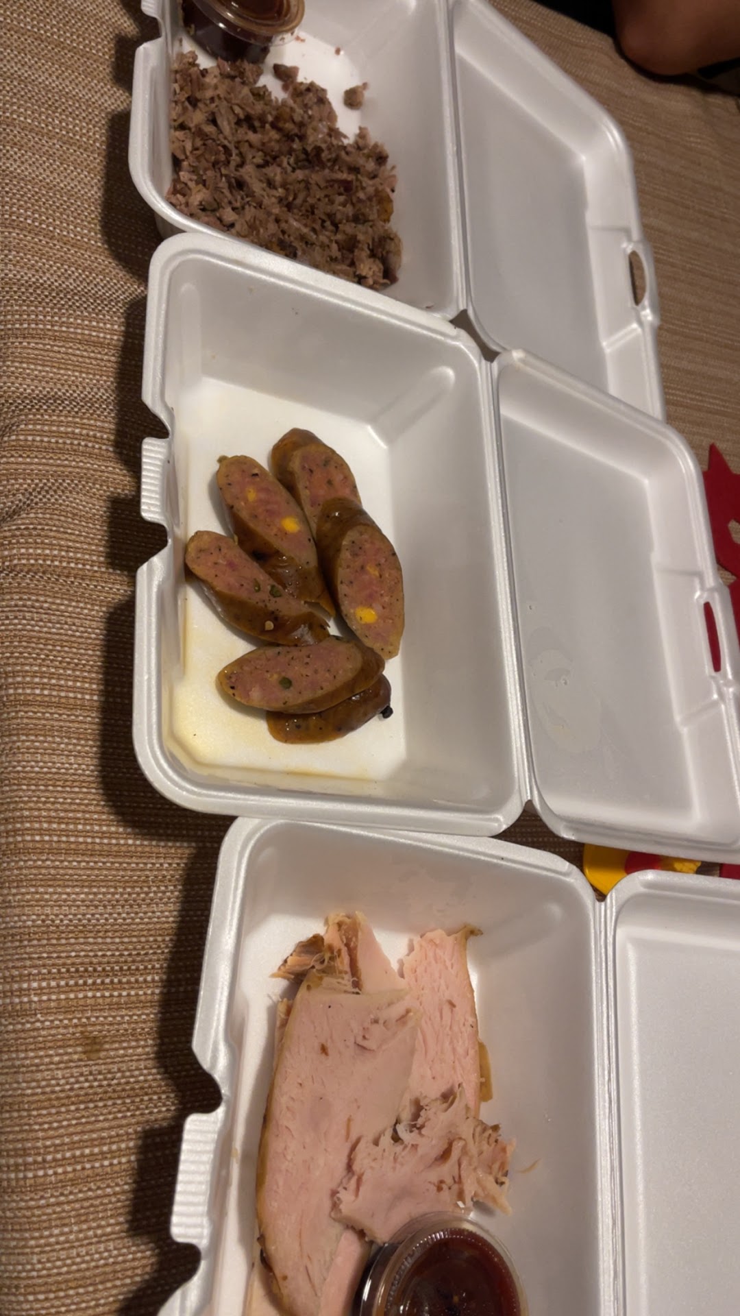 Ā Ā Ā Read moreDoes anyone know if this place has recently undergone an Ownership or Managerial change? We have been here 4 or 5 times in the past 3-4 months and our experience has been great each time. Friendly staff, and meats were good. We stopped by last night for some take out and it was a horrible experience. First, waited approximately 5 minutes to place our order (no one else in line) Menu has changed from what we usually get, so asked a few questions and their response was I think they changed the menu. After we ordered, they continued to ask us what sides we wanted. (at least 3 times). when we went to pay there were 4 people behind the counter. 2 of them were handling the orders, the other one was at the register, and the last guy was just standing there doing nothing. I asked him for an extra container, and he did not even acknowledge me. just stood there like he didn't understand English!!.It was a really weird situation. The guy at the registar cell phone rang, he answered it while we were trying to pay!!!! If that wasn't bad enough he carried a conversation for about a minute (which included that he had to stay because it was getting busy). Next up, once we got our food, we went to get some BBQ sauce to take with us. The containers (plastic ramikans) we so cheap that you could not put the lids on the containers. my wife went to put a lid on and the container just collapsed. and she ended up burning her hand from the BBQ sauce. So we asked for small side containers, (which they tried to charge us for), and got our sauce and left. Surprisingly, our order was correct, although they did seem stingy on the amount of meat we got. (compared to previous visits). Almost like they are trying to save every penny.