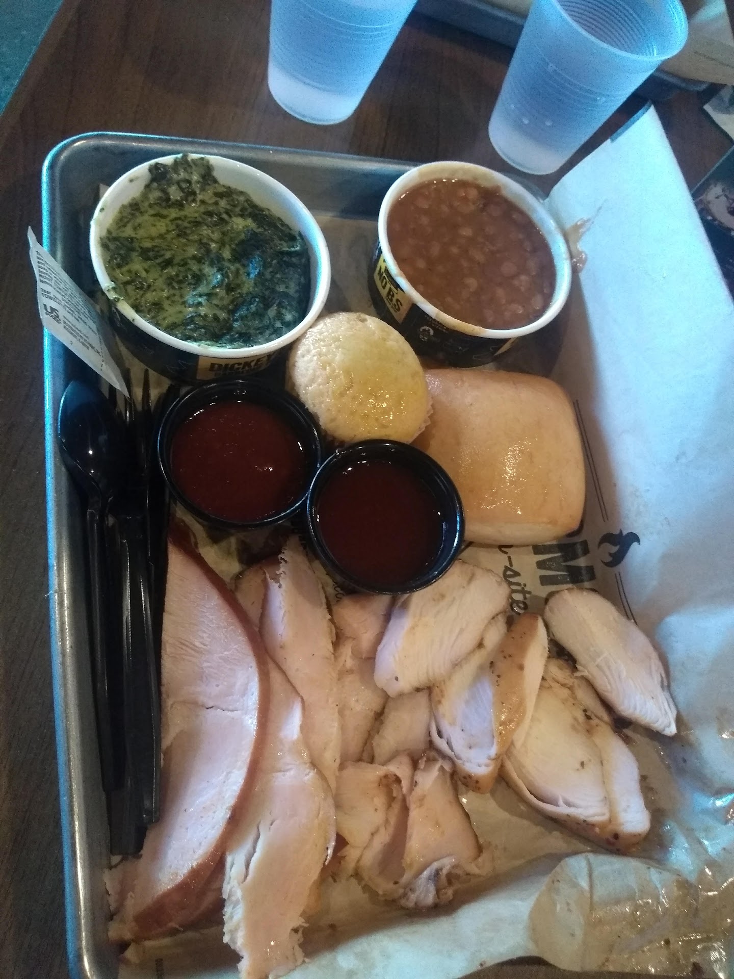 For our Baby shower we decided to order from Dickeys, and boy did that turn into a mistake. We ordered the wings, ribs, and pulled pork combos with large sides. Two yellow box packs. When we picked it up everything was listed on the boxes in sharpie and we assumed it had everything since it was written down.