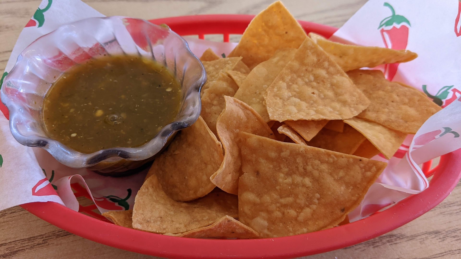 The salsa for the chips and salsa is green, but not remotely hot. Also, the quantity of salsa given isn't nearly enough for the amount of chips. The green chili on the #5 was also not hot at all, and largely devoid of flavor.