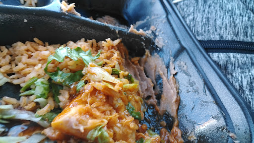 It came of two little things of sauce a green and red I'm assuming it's green chilies and red chilies The green chili one at least today was quite mild and absolutely delicious The platter came with a side of what looked like Spanish rice refried beans and cheese I dumped both of the green chili cups in there and mixed it all together and that was also excellent I normally don't like refried beans but that combo was delicious