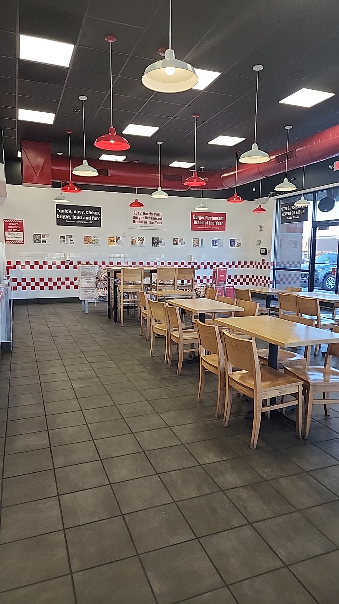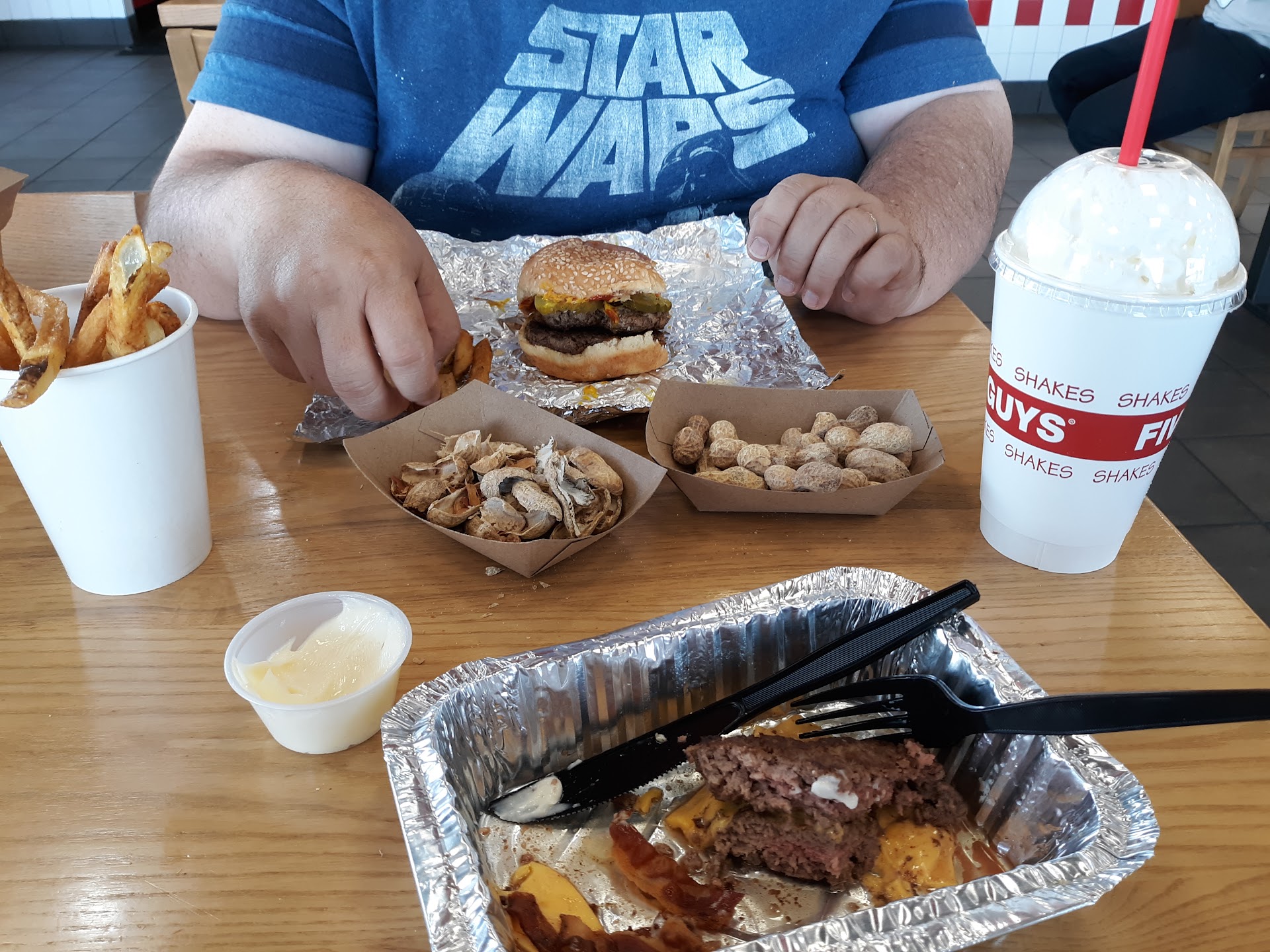 The dining area was a complete mess. Peanut shells laying on some table tops, on the floor, used napkins, filthy tables, the drink area and straw/lid area also needed cleaned. Meanwhile the young workers were standing around with arms folded and leaning against the counters talking, when they could've been out sweeping and wiping down the tables and chairs. I watched a couple come in, order, and walked around looking for the cleanest spot to sit and then approach one of the staff asking for the table to be wiped and the kid didn't know a what to do and shrugged his shoulders. The man went into the restroom, put soap on a wet paper towel and wiped down one of the tables and then let his wife sit down. There really is no excuse for this and I won't be returning to this location to dine in. Food was just ok. Our fries were cooked too long they were dark in color and crunchy and dry and they charged us for a chocolate shake but forgot to include when we picked up our order at the counter, at the end of our meal we did approach the counter and asked for our chocolate shake which they...