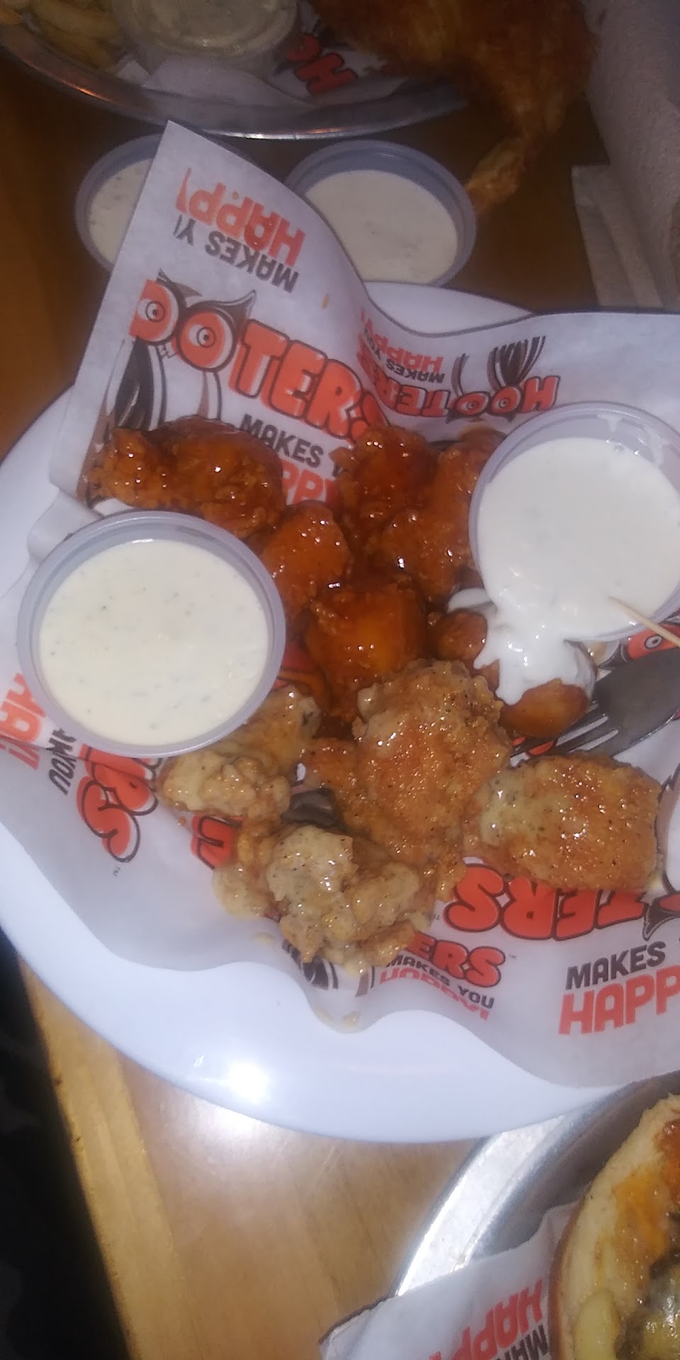 Hubbs and I stopped in for lunch on a Tues afternoon. We were seated quickly and pur server greeted us in a timely manner. She was happy and upbeat even though this is at the end of COVID and they had restrictions in place that to me seemed to take away a bit of Hooters charm. Cute smiling people friendly and engaging is what I come to expect from Hooters, but of course COVID has changed that a lot so I feel the ladies were still very sweet and inviting which made my visit here even better. I also found out a couple of the ladies here aee actually Hooters Calender girls! I think that's impressive, it shows they take their job serious and that's Awesome! We ordered a couple of beers and some boneless wings, honey bbq and parm garlic to start. The beer was served oce cold and quick the wings took about 8min and were great. Very saucy and I feel like we got a couple more than the 12 we ordered! 😎 Silly little notice but hey we find delight in the small things and appreciate a dining experience that gives us our monies worth! For our meal, my hubby went with the fish sandwhich and I went with the macaroni and cheeseburger! We were really hungry and figured sandwhiches would fill us up. Boy were we right and SUPER Surprised when our order arrived!! 💥😛 The sandwiches were COLOSSAL and mine looked just like the picture!! My husband's fish sandwhich was a whole filet of fish! It was great! We both laughed and smiled as pur server sat down his plate. We were expecting a lil frozen filet. The food tasted pretty good too. I personally make my mac and cheese a bit more tight and flavorful BUT I'm a Southern Black Woman who makes it as the star lf Thanksgiving meals so I try not to judge. All in all...we had a wonderful lunch and would recommend you stop by and grab a bite to eat and judge...