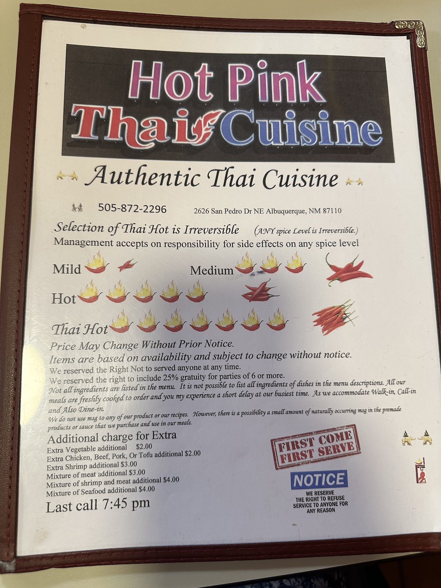 Read moreI won't comment on the atmosphere - I knew it was a hole in the wall type place and they already had a sign that it was served on paper/plastic cutlery. This review is just for the food and service. The good: Service was friendly and the food came quickly. Thai ice tea is good! The bad: Food is bland. We ordered two different noodle dishes and they seemed identical except one had egg and the other didn't. There was also very little meat in each - seems like corners are being cut for the price. We ordered one of the dishes Thai Hot and it was still bland and not particularly spicy despite the menu warnings. The ugly: Sticky rice with mango was made completely wrong. It wasn't sticky rice - just (leftover?) white rice with coconut poured on top. Really disappointing and I've never had that experience at any Thai...