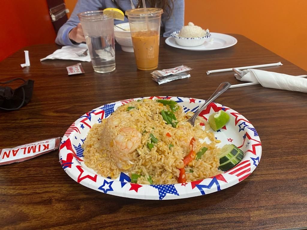 I ordered the pad Thai with tofu, mild spice. The dishes were delivered on paper plates, and after they were dropped off we did not see the server again. The pad Thai was quite bland, and my husband’s pineapple fried rice was both dry and tasteless.
