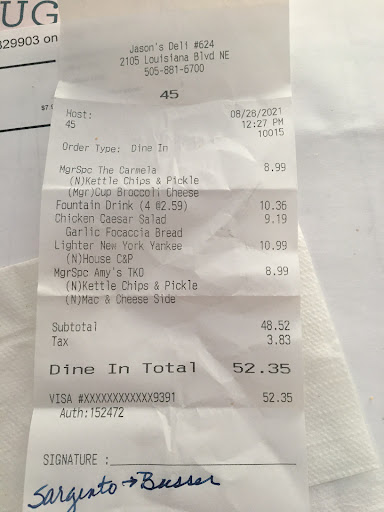 Read moreCame in yesterday for an evening summer lunch. The Jason's Deli location at the Louisiana business center is hard to miss as you drive by. The restaurant is certainly enormous and seating is more than plenty. Apart from the size, you'll also be pleased to observe the cleanliness of the deli. Tables are always wiped, the salad bar is well maintained, and the deli area is pristine. As for me, I ordered the Big E's Deli Burger with a side of chips and regular drink. The sandwich itself was decently portioned. However, it failed to meet the standard I remember from previous visits form both this location and its North West counterpart near Corrales. It almost appeared to have been assembled without any real care. The meat is usually packed very tightly resulting in a very savory taste and texture. On this occasion, the contrary was true, it was dry and loosely tossed together. Nonetheless, it vanquished my evening craving and I won't let deter me from returning in the future. Complementary ice cream is also a cleaver way to reassure yourself that customers will be drawn back to your eating establishment. In all, not my best experience at Jason's, but it's certainly still worth the consideration if you're in the...