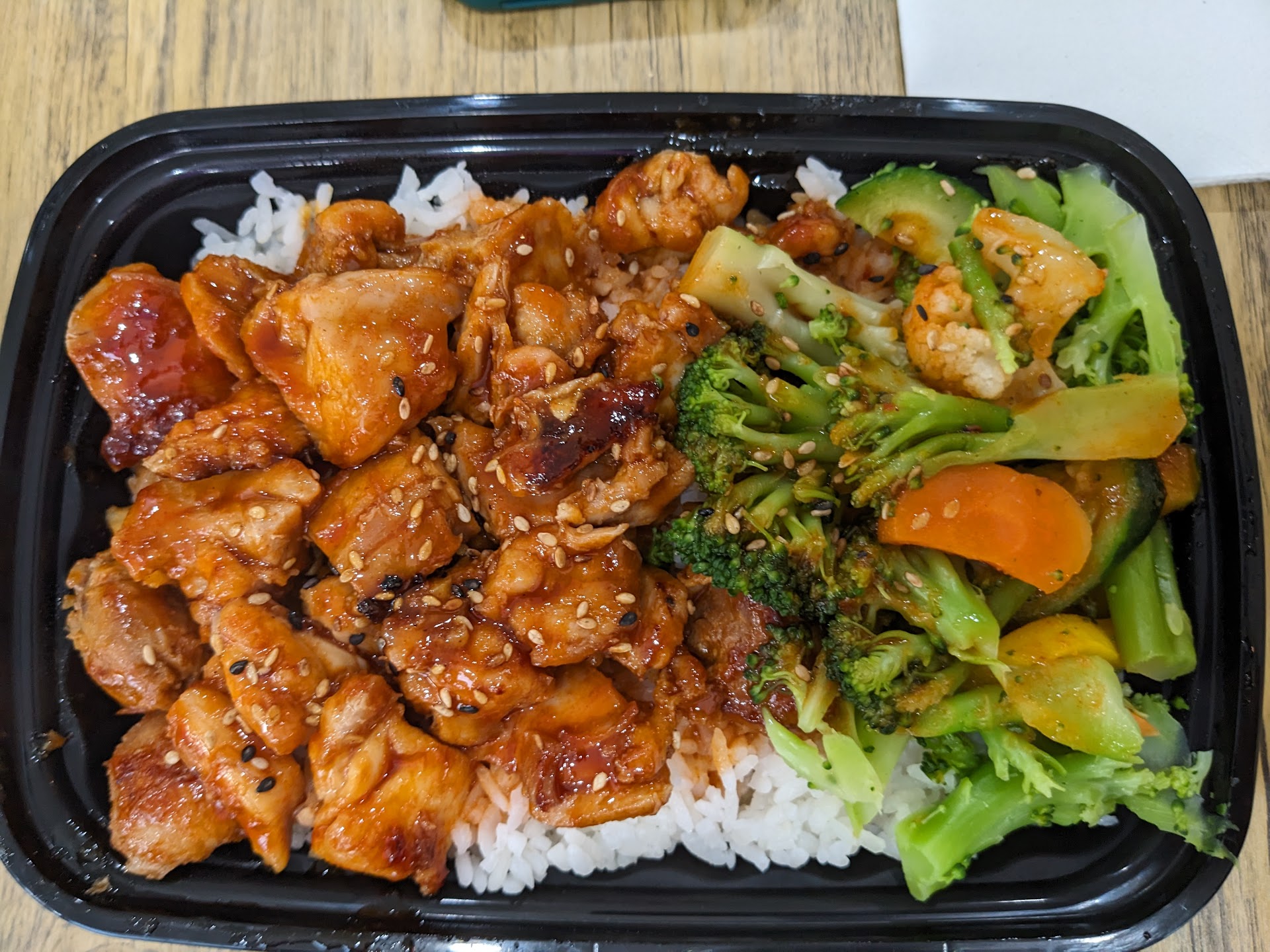 I ordered the spicy chicken bowl, which comes with spicy sweet chicken chunks, rice, and steamed veggies. The lady stated it was quite hot, an "8/10" and I'd say that was accurate. It really was quite spicy, but it was the kind that passed pretty quickly if you take a short break between bites. If you can't handle spice though, I'd go with the teriyaki chicken bowl instead.