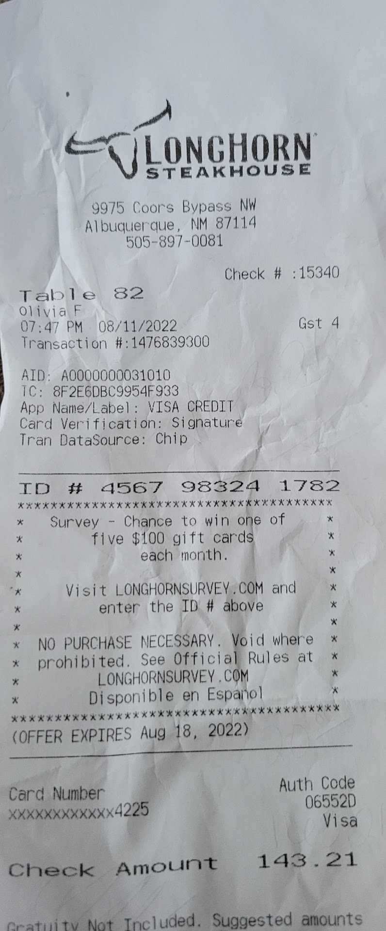 Read moreAfter half an hour wait, which was fine and very understandable, we were seated and a server named Brianna served us. She was pleasant and seemed to be new to the restaurant industry. She gathered our drinks and appetizers and went off to put them in. She returned with the drinks and straws and we ordered our food. About 5 to 10 minutes later our appetizers arrived and we enjoyed them. My nephew spilled his drink and dropped his fork, he is 5. After a while Brianna returned to the table and I asked her for some paper towels and another fork and drink for my nephew. She returned shortly with paper towels, but not the drink or the fork. She then came back after a while later and we asked her for his refill and fork again. She said she'd get us all refills and she did. But no straw or fork for my nephew. I walked up to the hostess stand and waited a couple minutes as the hostess was sitting some guests. I asked the hostess for a fork and a straw and was handed the fork, but told to get a straw from our server. I walked up to the bar and waited a couple minutes and asked a girl behind the bar for a straw and then dat back down. Our server shortly appeared after me getting what my nephew needed and she asked us if we wanted dessert. We were dumbfounded as we hadn't received our food yet. We told her and she was embarrassed and said she go check on it. At this point we had been sitting for about 45 minutes. It was busy and looked severely understaffed and being in the service industry I understood. Not seeing a manager on the floor the whole time indicated to me that the manager was probably cooking and/or expo for the food. I was aware that our food wasn't ran and that Brianna never checked to see if the food hit the table as she looked to be very new. She returned with our food and immediately we were aware that it was reheated as majority of it was Luke warm at best and other parts were cold. She returned and asked how we were doing. We said nothing. She left and sat there and ate our food because complaining is not a thing we do. Reviews are, but not complaining. We got the bill. Paid the full bill. And tipped her 20 percent because that's what you do. It is not her fault that she wasn't trained to get a manager if something is wrong. Or check the table if the food was ran. Or make sure the guest has what they need. She looked young and unexperienced and we didn't take that out on here. The management team in a whole, especially the general manager should be ashamed of themselves and embarrassed. And if there was a shortage of managers and the general manager was the one there cooking, then shame in the district/area manager to let any employee suffer like that and hurt customer service. Worst longhorn in existence and recommend getting food from the gas station down the street as the serive and food would far exceed their...