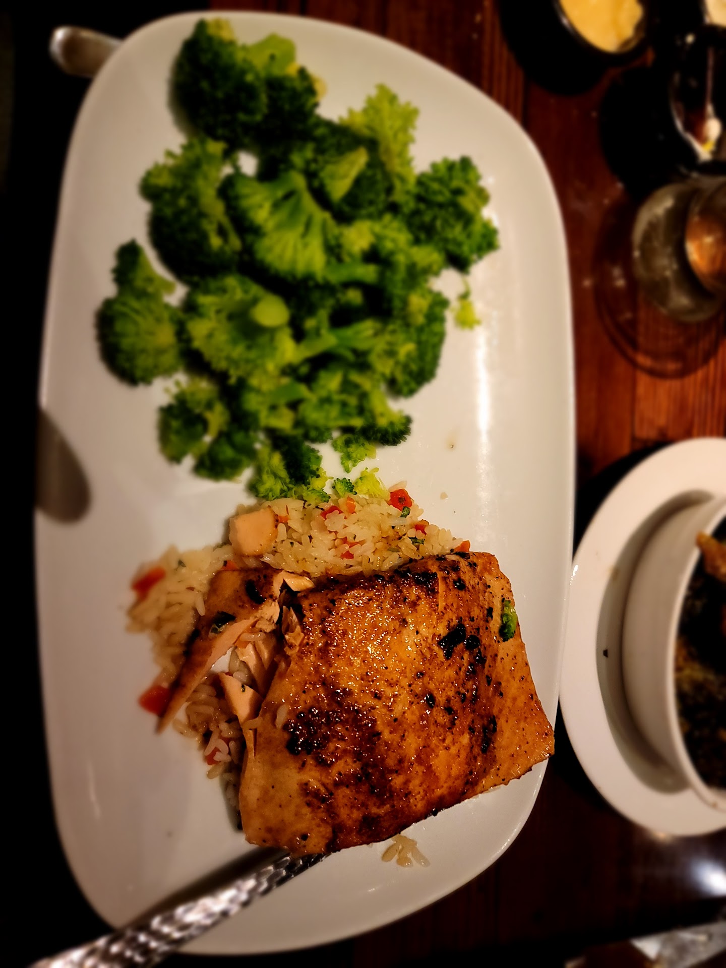 Arrived without issue, scored a nice parking space close to the front. The parking lot was debris free and the building exterior appeared well maintained and free of issues. Warmly greeted upon entry by the highly enthusiastic hostess. The interior was warm and inviting, tastefully decorated. The place was a ghost town so we elected to sit at the bar in hopes of obtaining better service, unfortunately the girl was often distracted and absent apparently on other issues then running the bar which made us feel notably less valued as guest then l would have preferred. Maintaining our drink refills soon proved problematic. I ordered the French Onion soup. I found the caramelized onions to be spot on with flavor intensity. Additionally we ordered the onion petals, it's LongHorn version of the blooming onion and found it far superior to anyone else's blooming onion. It arrived with a sauce that was heaven sent, divinely delicious. I would highly recommend experiencing the onion petals on any future visit. Additionally we received complimentary bread and butter which also proved highly addictive. I ordered the medium rare filet and lobster tail with a loaded baked potato. My dinning companion ordered the salmon. The meals arrived in short order. While I found my food hot, fresh and delicious, my steak was cooked to absolute perfection, the addition of some Worcestershire sauce completed it's flavor, unfortunately my companion found her bland fish lacking in flavor, something that the addition of a sauce probably would have improved. She replaced her meal with a chicken dish that she was equally unimpressed with. Personally l order steak at a steakhouse so l have no pity for people who order non steak items at steakhouses, that said, l found the entire evening to be filled with a delightful ambiance, wonderful food and good but certainly not great service. I'd gladly return again.