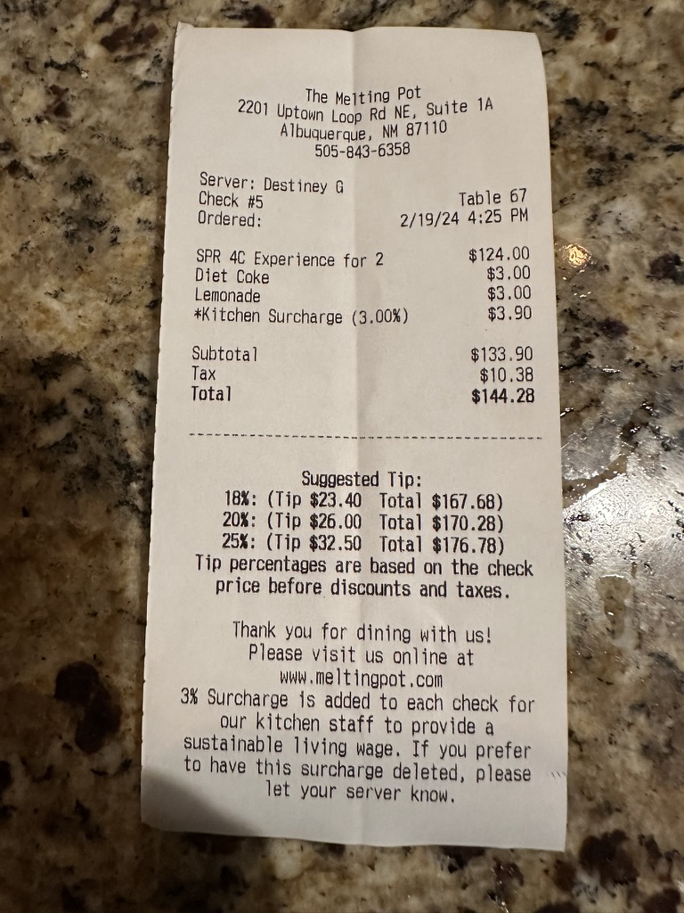 We went to dinner last night, 8-23-25, at the Melting Pot for my birthday. It is a place I usually really enjoy, and my husband wanted to make it special for me. My husband and I arrived on time at 8:00pm and were sat at our table within under 5 minutes. At our table there were menuâs so my husband and I started to talk about and plan our meal. It took our server 10 minutes to even acknowledge us. When he did, he apologized for the wait and told us two times he would be right with us. After about 10 more minutes, he arrived at our table to get our drink order. He stated that his handheld was broken so he had to take our order with pen and paper. At first, I was okay, things happen, people run late. Iâve worked in service so I know how it can be sometimes. We gave him our drink order, and our dinner order since we had time to look at the menu after waiting so long, then off he went. About ten minutes later, he dropped off our waters and left again. We then waited another 15 minutes for our drinks to arrive. At this point we have just been sitting there with a glass of water for about 30 minutes, it is now 8:30 and server drops off our drinks and tells us he lost our order and he took it again. I was still not upset, again I understand things happen. After we got our watered down drinks, we waited another 25 minutes for our appetizer to arrive. We had now sat 55 minutes with water and a drink. At this point I was starting to get a little annoyed. No one even stopped by our table to ask if we needed more water, or drinks, or anything. Finally, at 8:55pm we had something to eat. Our server forgot to bring us plates so he rushed back to the back to get some. When he gave them to us they were dripping with water and water got my dress wet, the table wet and dripped onto our seats! I had to use my napkin to dry them off so we could use them! Our appetizer tasted okay, nothing too great. As we were still eating our appetizer, our server dropped off our salad. This was also a huge disappointment. It was clearly a salad mix that had been rinsed and was given to us wet, with a huge amount of excess water dripping from the plate. The lettuce was also wilted and brown. My husband and I didnât eat it as it was wet and tasted gross. Next, our server brought out our entree. He dropped it off without an explanation or instructions. Good thing I had been there before and was aware of what to do. But this is what finally got me. Once again he gave us wet plates!! But not only were they wet, they were dirty!! I was so disgusted and upset at this point, I began to cry. It was my special birthday dinner with my husband and the server had completely ruined it. He took 30 minutes to get us drinks, an hour to get us an appetizer, and our entree was given to us to eat on dirty, wet plates. My husband saw that I was upset and asked for the check. We didnât even eat our entree!! When our check came, our server charged us for the complete 4 course meal even though we didnât eat the entree or the dessert. So my husband questioned the server and he brought out some fruit and literally on ounce of chocolate in a to go box! It was despicable. We paid our bill and left. We had spent over an hour there with the worst service we had ever received and didnât even get to eat! It was now well after 9:30 pm and it was too late to eat at another restaurant. Please note my husband and I are very kind people, we were dressed well, and the restaurant was not very busy. I am so disheartened that my birthday dinner was ruined with poor service. We spent over $150 for two drinks, a mediocre appetizer, some wet, brown salads and entrees that were given us to eat with dirty dishes! Also, the bathroom was disgusting with dirty toilets and faucets with crusty brown stuff under the faucet handle. I have never had such a horrible dining experience in my life. I will never eat there again and I will tell all my friends and family to do the same. It is completely disheartening that we had to experience this when we were trying to celebrate a...