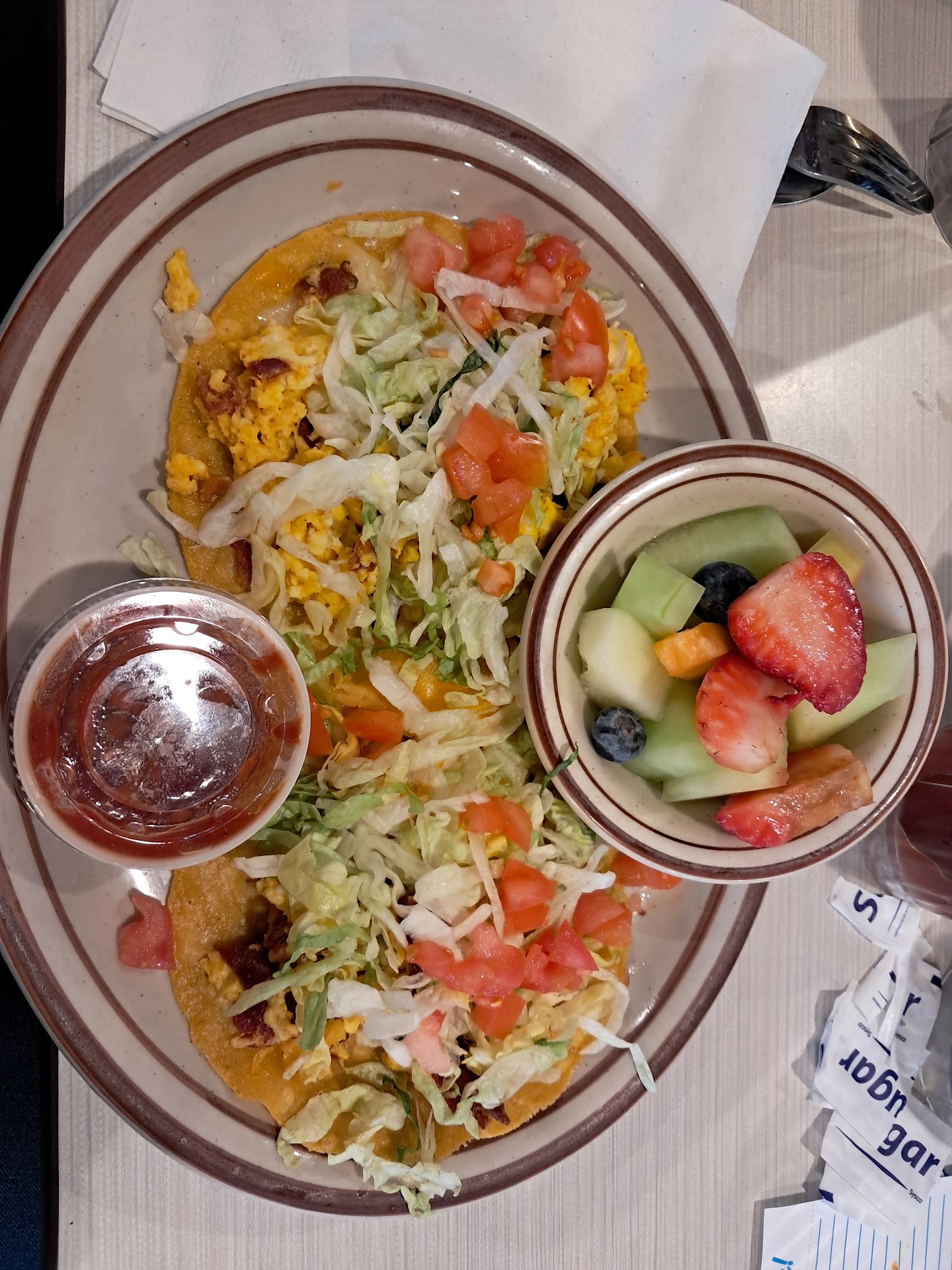 We ordered, and even as busy as it was that morning, our food came out in less than 10 minutes hot and looking good. I ordered the chicken fried steak with gravey and green chili because that's how I roll. My soon to be wife ordered breakfast tacos. My steak was virtually unedible because it was from the preformed frozen verity of beef like substance. The eggs hashbrowns and gravey were good. The breakfast tacos were disappointing, and even the eggs were tasteless and burnt.