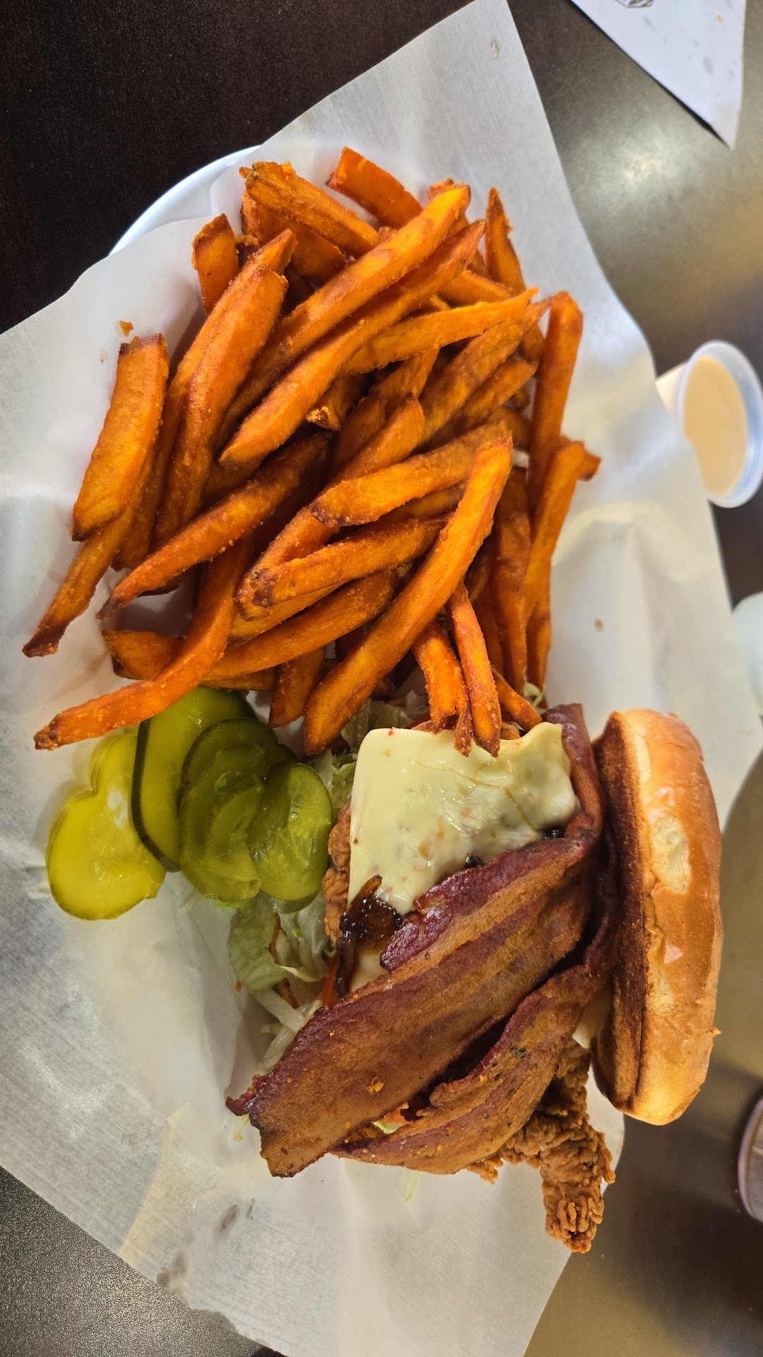 My husband and I both ordered the "Chicken Sandwich" with no amendments, but substituting sweet potato fries for the regular fries.