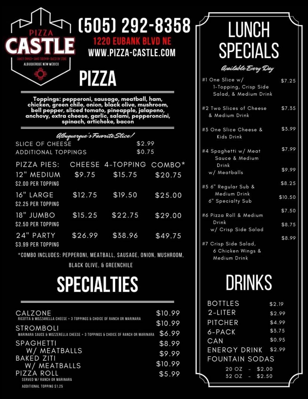 As a long-time Albuquerque resident, I'm amazed I hadn't discovered Pizza Castle sooner. After trying it for the first time recently, we've already been back three more times - it's that good! Pizza Castle is conveniently located on Eubank Blvd, making it easily accessible from most parts of the city. But be aware that the building is easy to miss if you aren't looking for it.