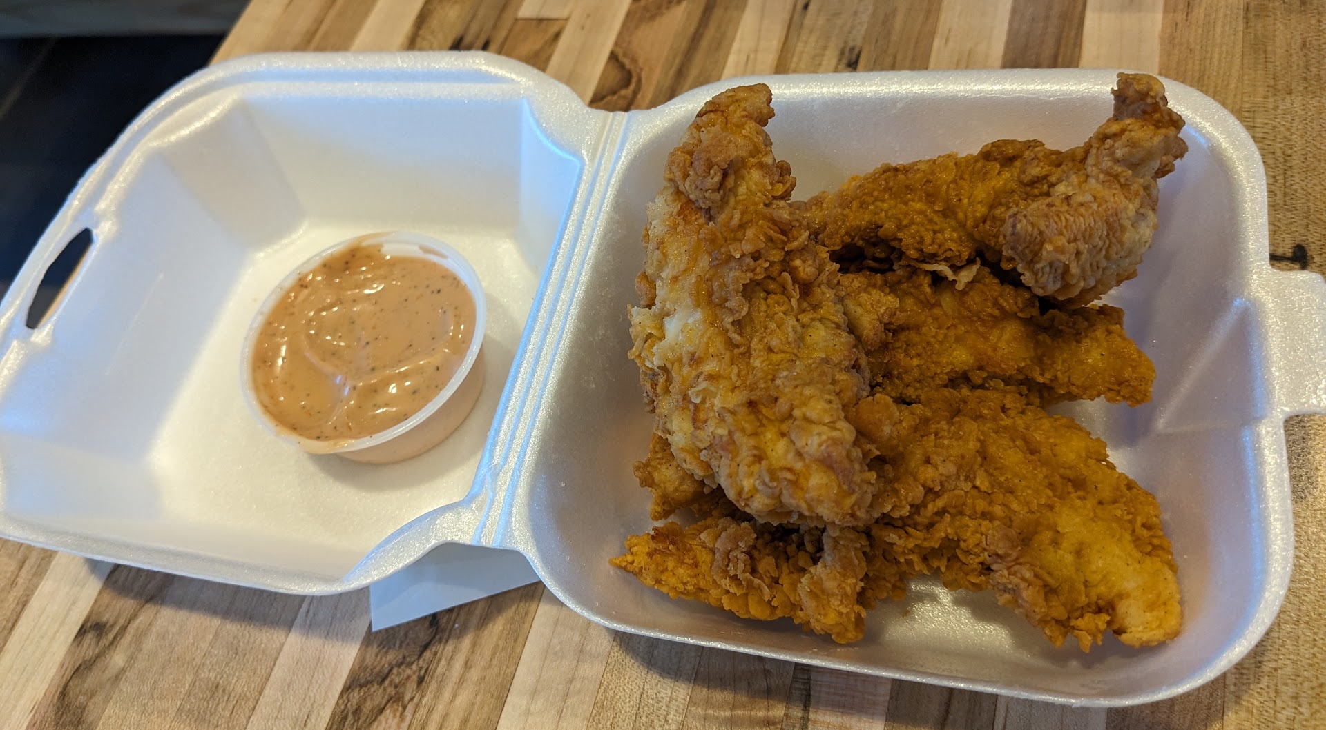 Cains chicken is interesting. It's very lightly, but very crisply, battered. The outside almost reminds me of corn flakes. Light, delicate, very crunchy. But, here's the thing: The chicken and the batter on their own have very little flavor. Minimal salt and spices (though not NONE; it does have some taste). So that means the chicken flavor is pretty pure, but also pretty bland. The chicken itself is very tender. The sauce is critical, and when combined with the crispy texture makes it a decent combo. But i don't love it. I think KFC and Popeyes have better flavored chicken, without needing sauce.
