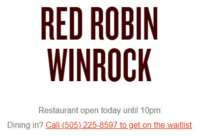 Read moreLet me paint the scene. We were visiting family in Albuquerque and decided to grab a bite to eat before returning home. There were 4 adults, 2 kids, and 2 toddlers equalling 8 people total. We called ahead to see if it will be ok to be seated together. The person on the phone hesitated but then said it could be done so we made the reservation. We get there and we are seated together. When the waitress leaves after taking our drink and appetizer orders the Manager comes up. He then explains we have a problem cause there are more than 6 of us. There can't be more than 6, including toddlers, due to state mandate. I understand the manager was doing his job and protecting his business. He even said he will take our appetizers off the bill. We told him we understood and moved tables to the other end. We put the kids on their table and had the adults and one toddler at the other. We ordered our meals and received our appetizers and life was good. Then service started to slip. Glasses for our table went empty. Our server came multiple times and didn't refill our drinks. We looked around and the whole area didn't have drinks. It was about 15-30 min of empty glasses. We finally received our food and everything was cold except for my sister in laws fish. The cheese sauce on my son's Mac and Cheese was stating to glaze some. My brother in laws meal was completely wrong. By the time we were done, we were pretty frustrated. We received our bills and the appetizers were still on! We told our waiter they needed to be taken off and he froze for a second. Not the service or food quality Red Robin is known for. I understand with this pandemic things have been a little crazy but I feel like the staff needs to work on their communication and ensure the guests are being...