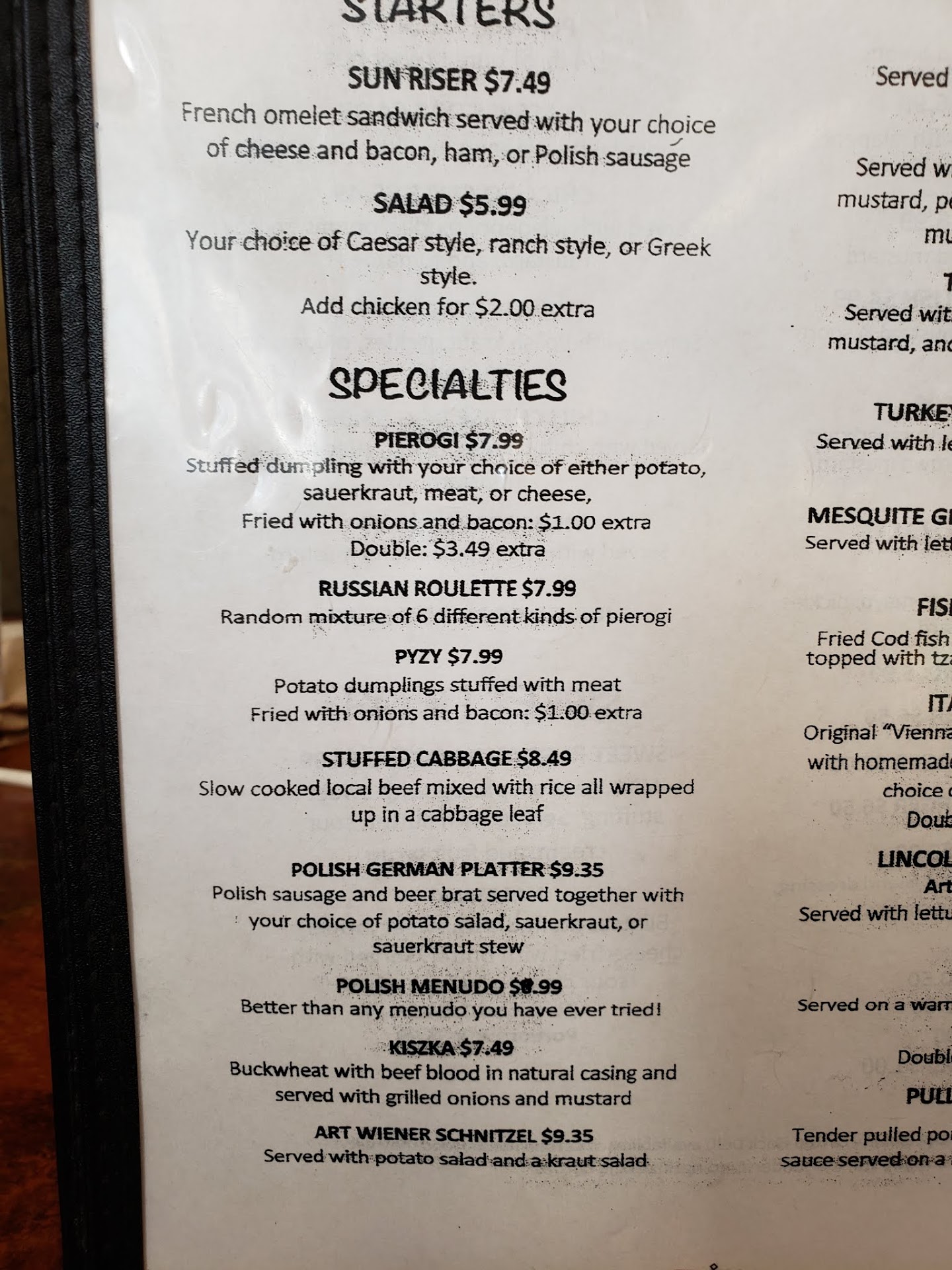 Today for an early dinner I had the Art Wiener Schnitzel (breaded pork cutlet), my kid the Gyro, my wife the Ukrainian Borscht, and we all shared mushroom and kraut pierogi. For dessert they had a poached peach something Helene, and we got the sweet pierogi. The sweet berry pierogi was awesome ... the peach dish could easily qualify for an exceptionally high end, fine dining type dessert ... it looked high end, and was exceptional with numerous tastes all working together ... but still separate and unique. Hard to describe, but over the top good. My daughter loved the sweet cheese pierogi.